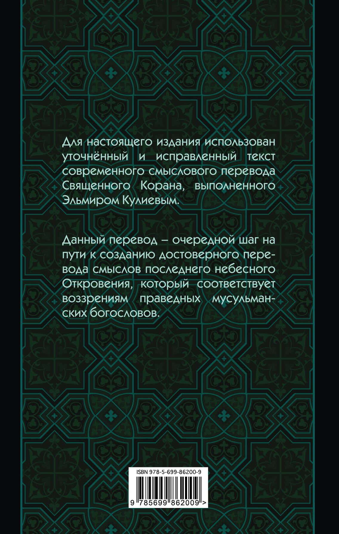 Эльмир Кулиев - автор более 50 монографий, статей и переводов теологической литературы с арабского, азербайджанского и английского языков, научный редактор целого ряда книг. Но самая главная работа Э. Кулиева - перевод Священного Корана, который он завершил в 2002 году, впоследствии подверг редактированию и дополнил комментариями. Данное издание содержит уточненный и исправленный текст перевода Священного Корана.| Издательство | ООО "Издательство "Эксмо" |