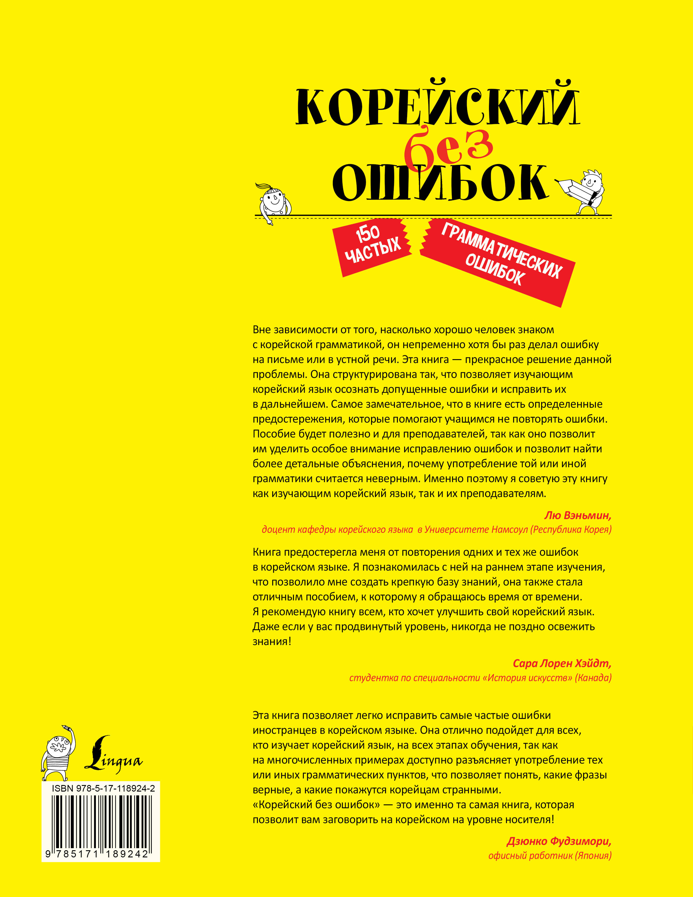 "Корейский без ошибок" - это первое издание мирового бестселлера "Correct your Korean" на русском языке. В пособии представлен подробный разбор самых частых ошибок, которые допускают изучающие корейский язык. Яркие примеры и многочисленные таблицы помогут быстро понять самые сложные нюансы корейской грамматики, а тесты по типу международного экзамена ТОРIK после каждой темы позволят быстро закрепить пройденное. Книга предназначена всех, кто изучает корейского язык самостоятельно или на специализированных курсах, а также для преподавателей.