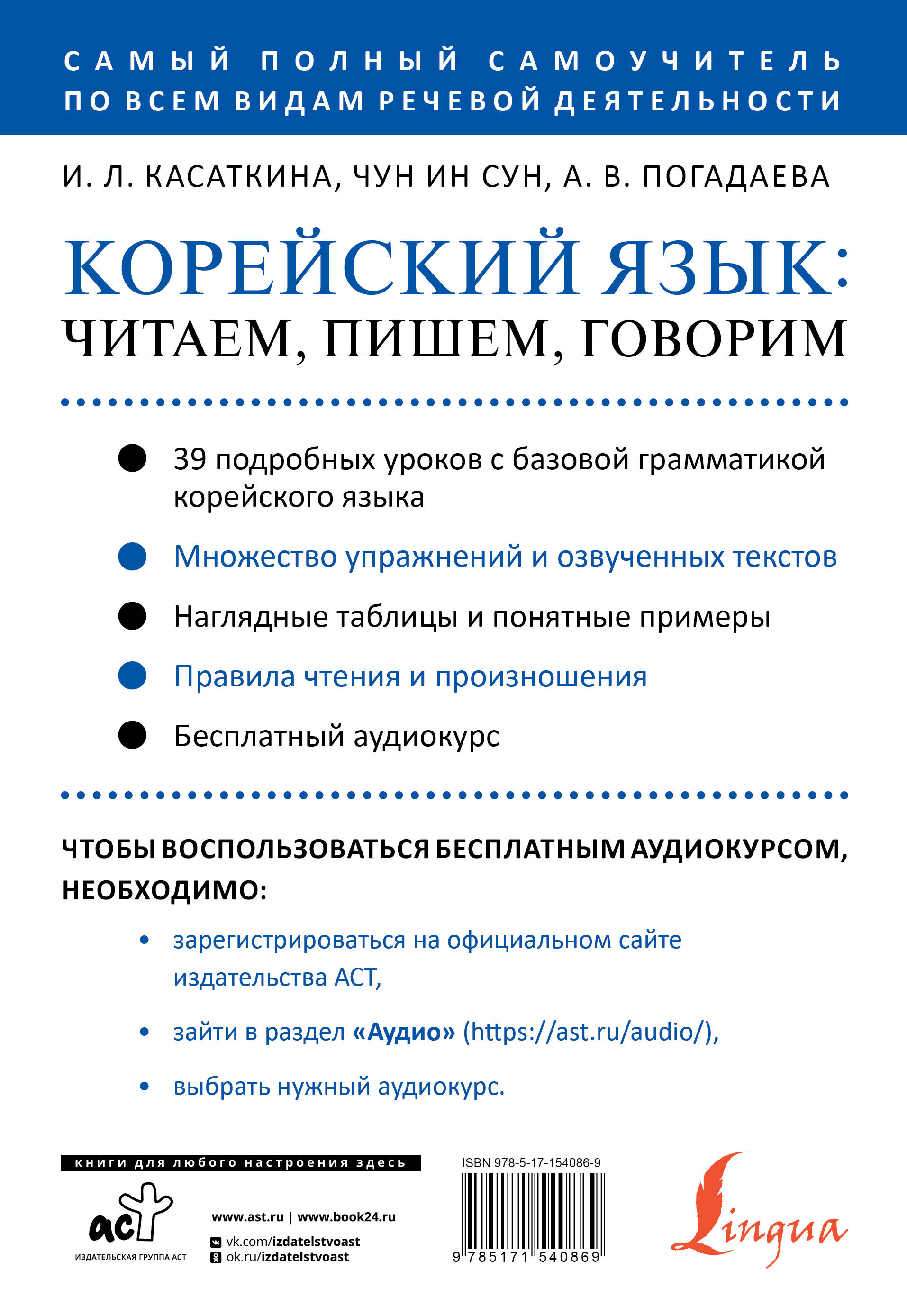 Касаткина Ирина Львовна, Чун Ин Сун, Погадаева Анастасия Викторовна - признанные специалисты в области корейского языка. И. Л. Касаткина и Чун Ин Сун - преподаватели Института стран Азии и Африки МГУ, А. В. Погадаева - Института восточных культур и античности РГГУ. Книга состоит из 39 уроков, в которых емко и понятно излагается теория. Каждый урок содержит разнообразные упражнения, которые позволяют развивать все виды речевой деятельности: чтение, письмо, слушание и говорение. Все задания на аудирование, диалоги и тексты озвучены носителями корейского языка, что поможет поставить правильное произношение и развить восприятие корейского языка на слух. Аудиокурс доступен совершенно бесплатно на официальном сайте издательства АСТ: https://ast.ru/audio. В конце книги даны ключи к упражнениям. Пособие подходит для начинающих изучать корейский язык самостоятельно или на специализированных курсах.| Издательство | ИЗДАТЕЛЬСТВО "АСТ" |