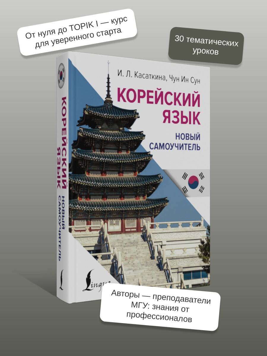 "Корейский язык. Новый самоучитель" дает возможность освоить корейский язык на уровне TOPIK I. Самоучитель состоит из 30 уроков, содержащих необходимый набор лексики по теме и основной грамматический материал с пояснениями, которые затем отрабатываются с помощью упражнений, диалогов и небольших текстов для чтения и/или перевода. Все тексты сопровождаются словарем и лексико-грамматическими комментариями, а в конце книги помещены ключи ко всем письменным упражнениям курса. Данное учебное пособие подготовили признанные специалисты в области корейского языка и культуры, преподаватели Института стран Азии и Африки МГУ Ирина Львовна Касаткина и Чун Ин Сун. Издание предназначено для читателей, начинающих изучать корейский язык самостоятельно и нацеленных на качественное овладение языком, а также для студентов высших языковых и неязыковых учебных заведений, изучающих корейский язык.| Издательство | Издательство "АСТ" |