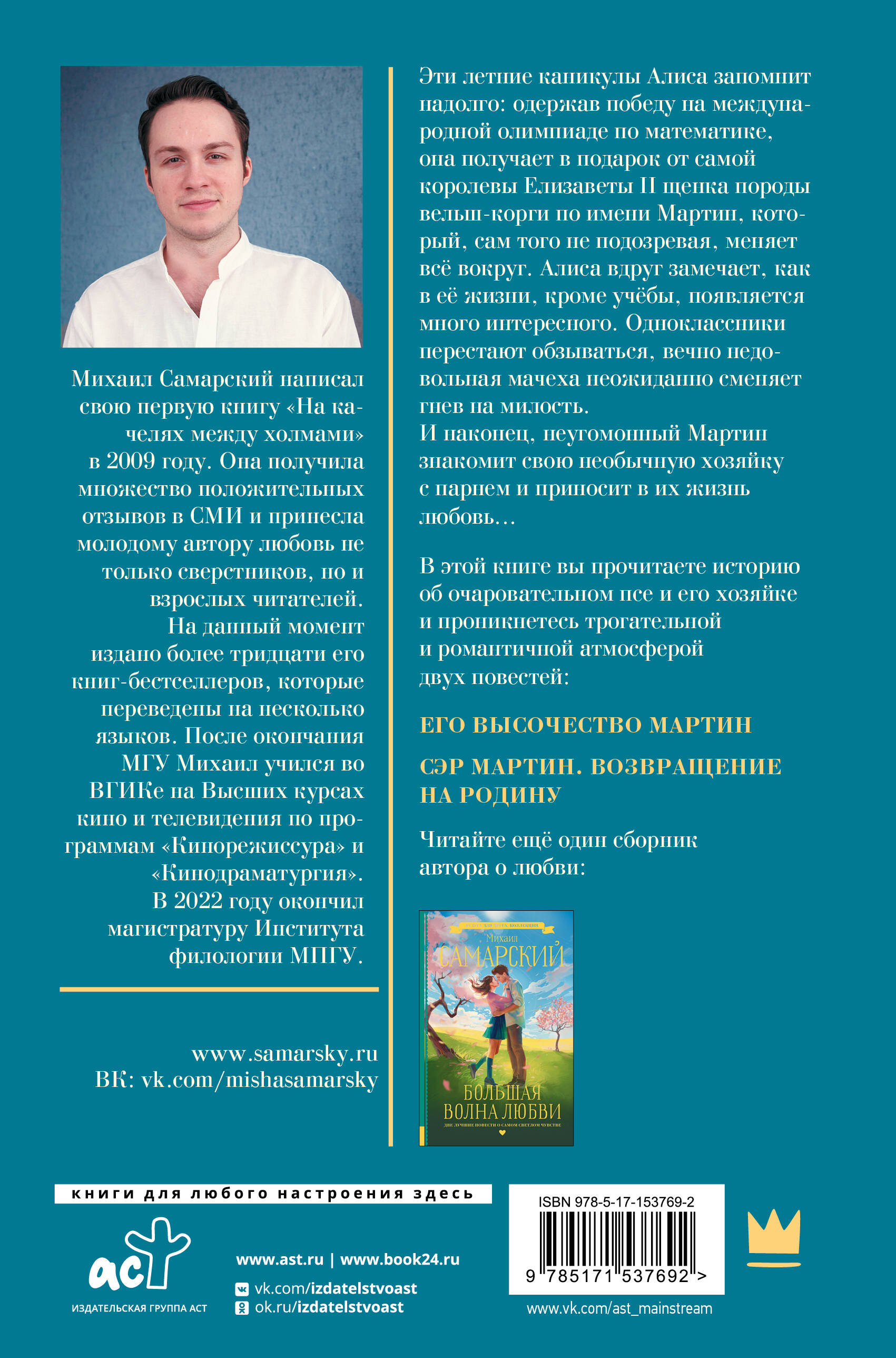 Эти летние каникулы Алиса запомнит надолго: одержав победу на международной олимпиаде по математике, она получает в подарок от самой королевы Елизаветы II щенка породы вельш-корги по имени Мартин, который, сам того не подозревая, меняет всё вокруг. Алиса вдруг замечает, как в её жизни, кроме учёбы, появляется много интересного. Одноклассники перестают обзываться, вечно недовольная мачеха неожиданно сменяет гнев на милость. И наконец, неугомонный Мартин знакомит свою необычную хозяйку с парнем и приносит в их жизнь любовь… В этой книге вы прочитаете историю об очаровательном псе и его хозяйке и проникнитесь трогательной и романтичной атмосферой двух повестей: "Его Высочество Мартин", "Сэр Мартин. Возвращение на родину".| Издательство | ИЗДАТЕЛЬСТВО "АСТ" |