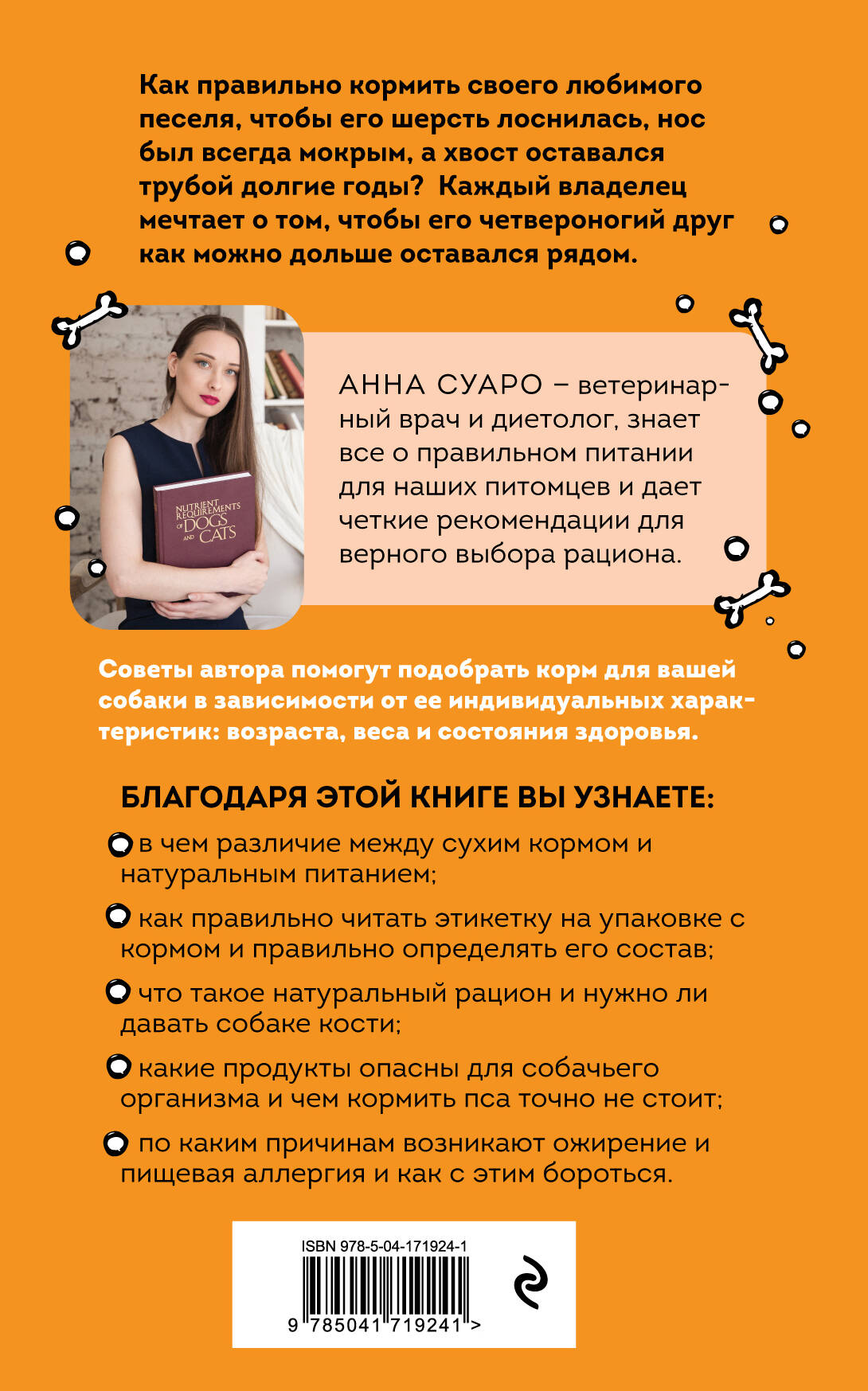 Как правильно кормить своего любимого песеля, чтобы его шерсть лоснилась, нос был всегда мокрым, а хвост оставался трубой долгие годы? Эта книга для тех, кто задается вопросами сохранения здоровья своих питомцев, но не может определиться с типом питания, видом корма и рационом. Рекомендации ветеринарного диетолога Анны Суаро помогут вам подобрать корм для своей собаки в зависимости от ее индивидуальных характеристик: возраста, веса и состояния здоровья. Благодаря этой книге вы узнаете: - в чем различие между сухим кормом и натуральным питанием; - как правильно читать этикетку на упаковке с кормом и правильно определять его состав; - что такое натуральный рацион и нужно ли давать собаке кости; - какие продукты опасны для собачьего организма и чем кормить пса точно не стоит; - по каким причинам возникает ожирение и пищевая аллергия и как с этим бороться.| Издательство | ООО "Издательство "Эксмо" |