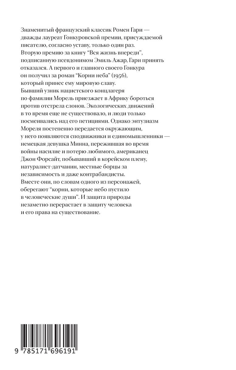 Вы когда-нибудь задумывались о том, что значит по-настоящему бороться за свои идеалы? Роман Ромена Гари «Корни неба» - это история человека, который бросил вызов всему миру ради спасения слонов, истребляемых в промышленных масштабах. В послевоенной Африке, где главенствуют колонизаторы, охотники и контрабандисты, француз Морель становится борцом за право беззащитных гигантов на существование. Но кто поддержит его борьбу? Местные жители больше обеспокоены выживанием, а охотники и контрабандисты видят в слонах лишь источник пропитания и дохода. К голосу Мореля не прислушиваются, его идеи считают безумными, но он не сдается. Его война выходит за рамки экологии - она становится символом борьбы за справедливость в мире, где правят жестокость и цинизм. Книга, удостоенная Гонкуровской премии в 1956 году, до сих пор остается актуальной. Этот роман - о границах, которые человек готов перейти ради своих идеалов. Где проходит черта между борьбой за правое дело и фанатизмом? Может ли один человек действительно изменить мир? Гари задает эти вопросы, но не дает однозначных ответов. Он показывает мир таким, какой он есть: сложным, противоречивым, но все же полным надежды