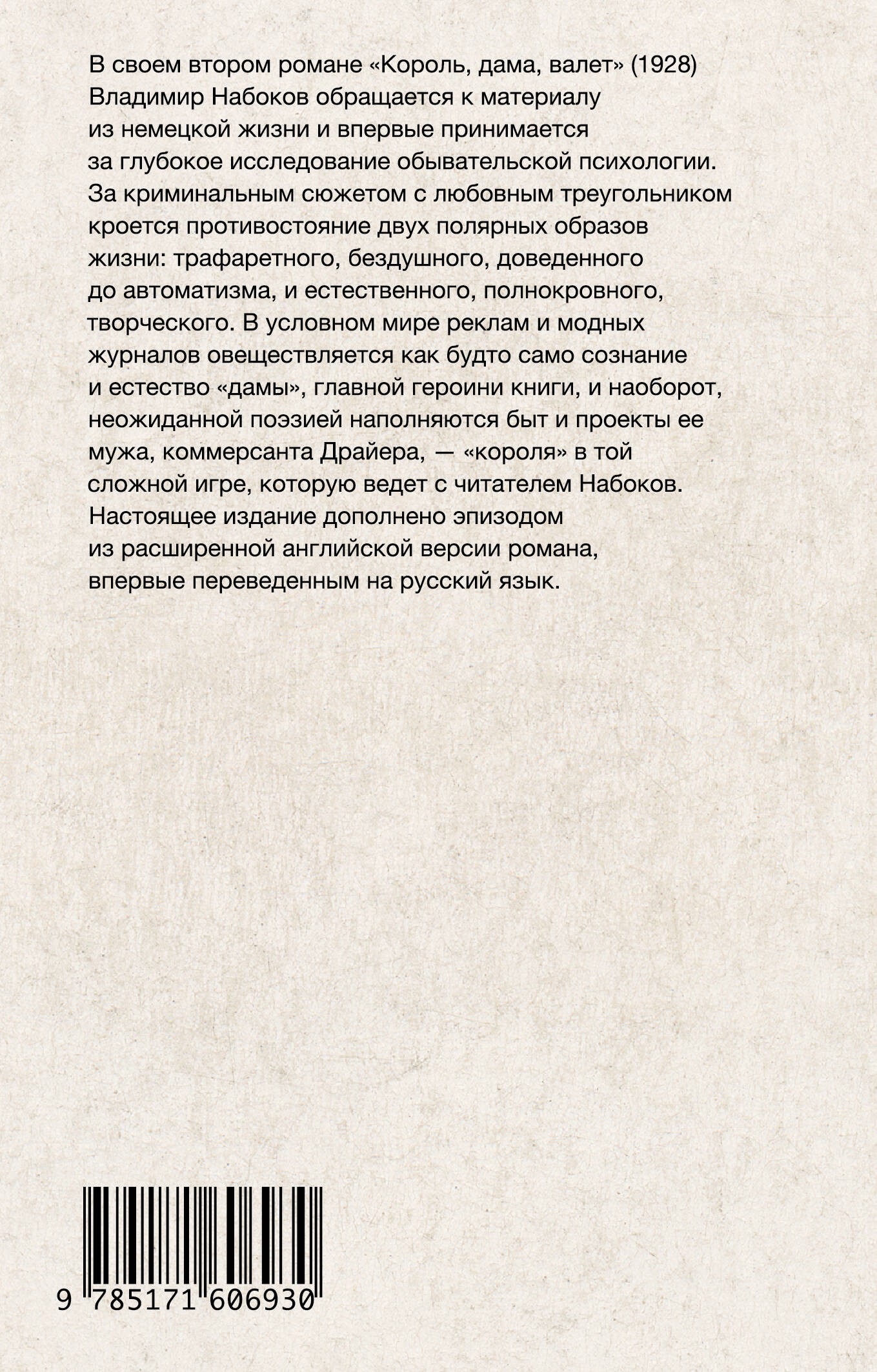 В своем втором романе, вышедшем в Берлине в 1928 году, Набоков отходит от биографичности и ностальгических тонов "Машеньки" и дает волю фантазии. Именно "Король, дама, валет" знаменует рождение писателя Набокова (пишущего пока под псевдонимом В. Сирин), который вскоре покорит сначала Европу, а затем и Америку. Сюжет, словно бы взятый из низкопробного бульварного романа, - лишь прикрытие для изощренной игры с читателем. Герои его - самые обычные, которых можно встретить, например, в вагоне поезда. Там, собственно, читатель с ними и знакомится, словно бы случайно задержав свой взгляд на этой троице. Богатый муж, меркантильная жена и бедный родственник. Естественно, по правилам бульварного любовного романа, оба мужчины влюблены в одну женщину. Сквозь этот банальный любовный треугольник Набоков, как сквозь призму, рассматривает все основные страхи, чаяния, сексуальные комплексы и интеллектуальные устремления человека начала XX века, который на самом деле не слишком отличается от человека начала века XXI.| Издательство | Издательство "АСТ" |
