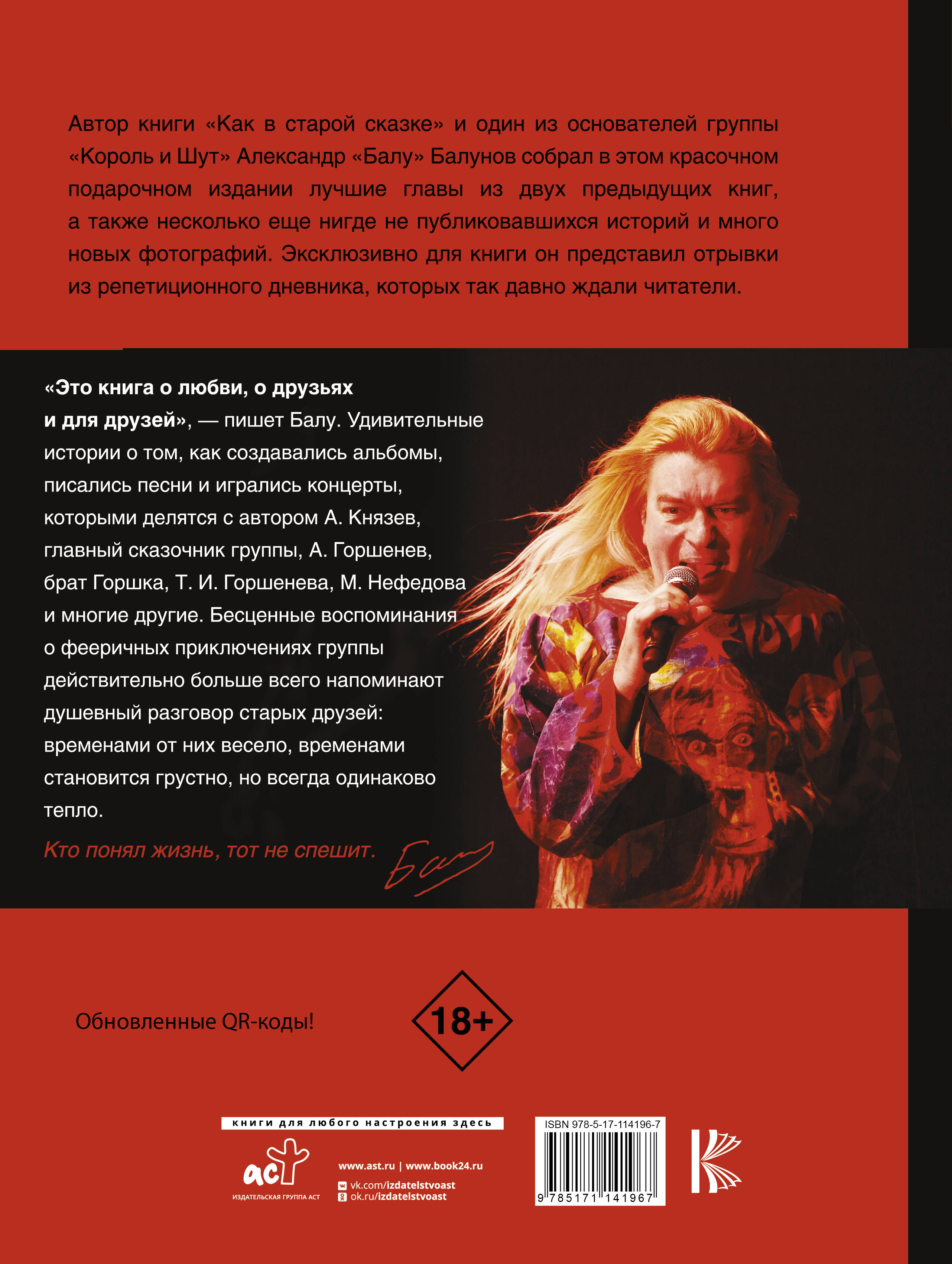 "Король и Шут" - легендарная рок-группа, которая перевернула советскую музыкальную сцену и до сих пор остается незабываемой. Вы познакомитесь со многими удивительными людьми, которые оказали влияние на жизнь и творчество "Короля и Шута", и узнаете о том, как группа создавала свои незабываемые хиты. Книга Александра Балунова "Король и Шут. Как в старой сказке" - ваш проводник в закулисье легендарной группы.| Издательство | ИЗДАТЕЛЬСТВО "АСТ" |