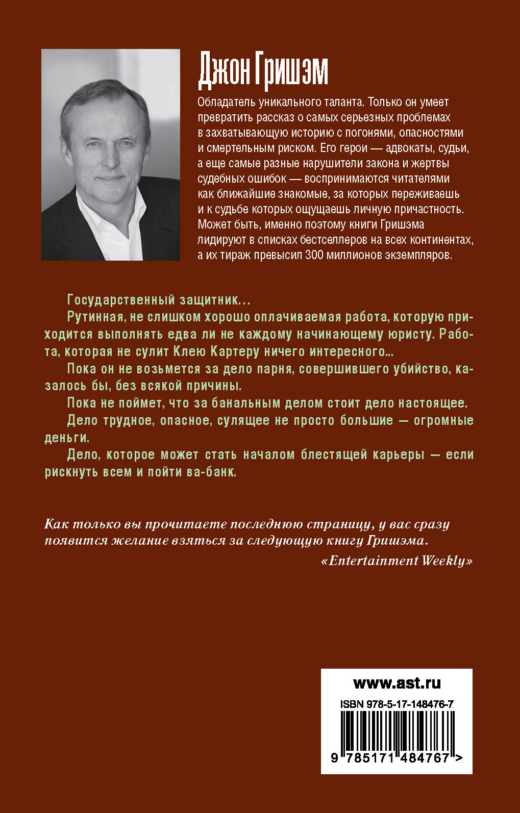 Государственный защитник… Рутинная, не слишком хорошо оплачиваемая работа, которую приходится выполнять едва ли не каждому начинающему юристу. Работа, которая не сулит Клею Картеру ничего интересного... Пока он не возьмется за дело парня, совершившего убийство, казалось бы, без всякой причины. Пока не поймет, что за банальным делом стоит дело настоящее. Дело трудное, опасное, сулящее не просто большие - огромные деньги. Дело, которое может стать началом блестящей карьеры - если рискнуть всем и пойти ва-банк.| Издательство | АСТ |