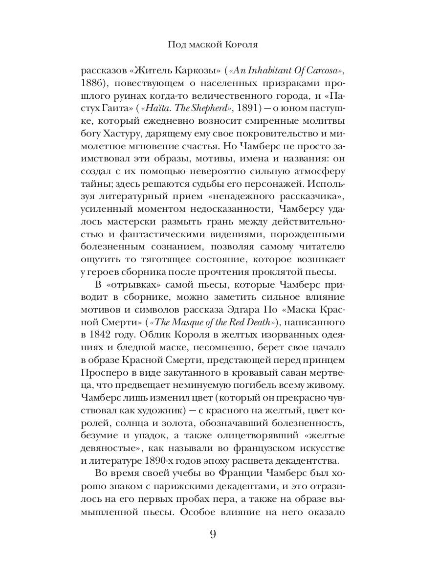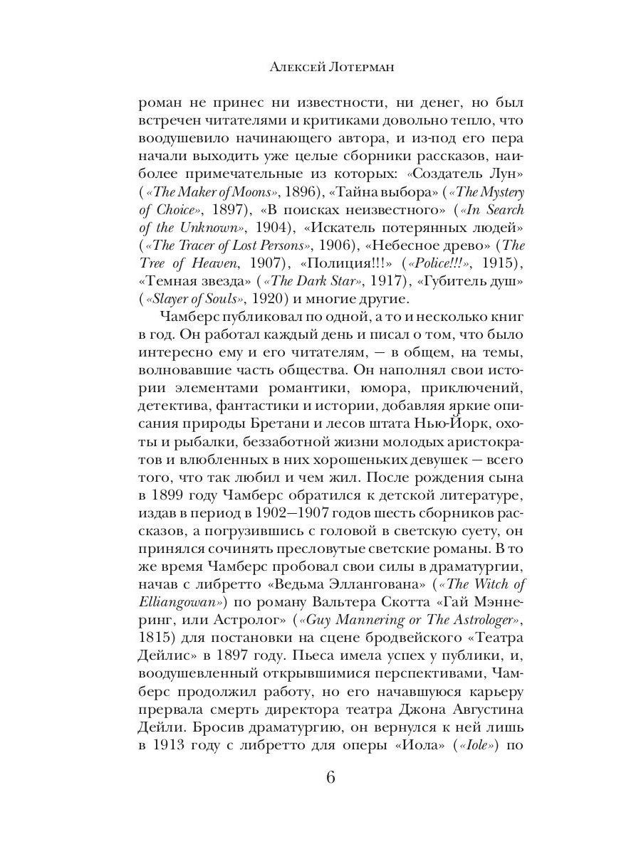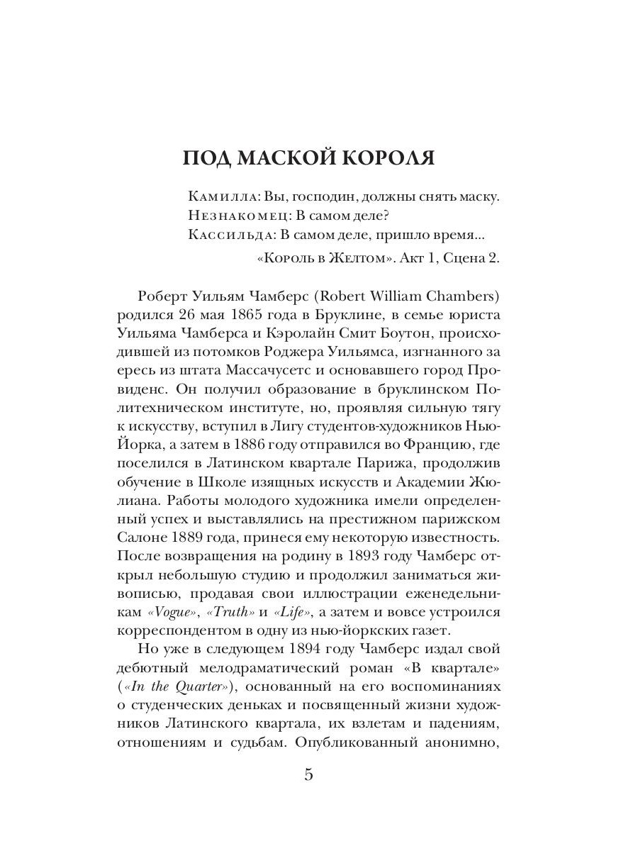 Величайший цикл рассказов конца XIX - начала ХХ века! Отложив книгу, они больше не были уверены в том, насколько реальны события вокруг… Начало альтернативного ХХ века. Во всех городах Соединенных Штатов гуманное правительство открывает Дворцы Смерти для желающих свести счеты с жизнью… Запрещенная к распространению богохульная пьеса "Король в Желтом" вызывает эпидемию душевных расстройств… Тревожные сны людей друг о друге, странные совпадения и преследования в Америке и Европе… Как все эти события связаны между собой и какую роль здесь играет предание о божественно прекрасной Каркозе - городе, который должен посетить каждый поэт и мечтатель, даже если окажется заперт здесь навеки?..
