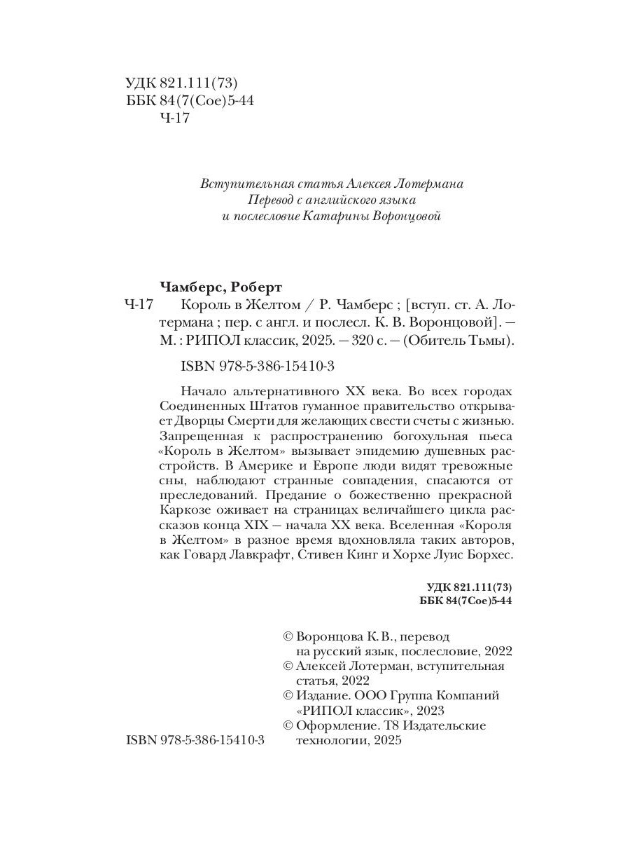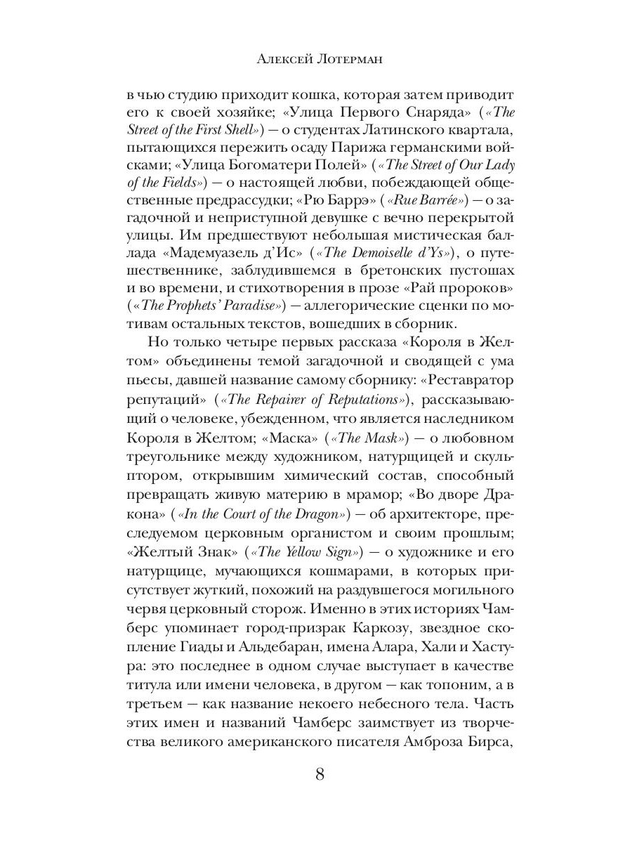 Величайший цикл рассказов конца XIX - начала ХХ века! Отложив книгу, они больше не были уверены в том, насколько реальны события вокруг… Начало альтернативного ХХ века. Во всех городах Соединенных Штатов гуманное правительство открывает Дворцы Смерти для желающих свести счеты с жизнью… Запрещенная к распространению богохульная пьеса «Король в Желтом» вызывает эпидемию душевных расстройств… Тревожные сны людей друг о друге, странные совпадения и преследования в Америке и Европе… Как все эти события связаны между собой и какую роль здесь играет предание о божественно прекрасной Каркозе - городе, который должен посетить каждый поэт и мечтатель, даже если окажется заперт здесь навеки?..| Издательство | Рипол Классик |