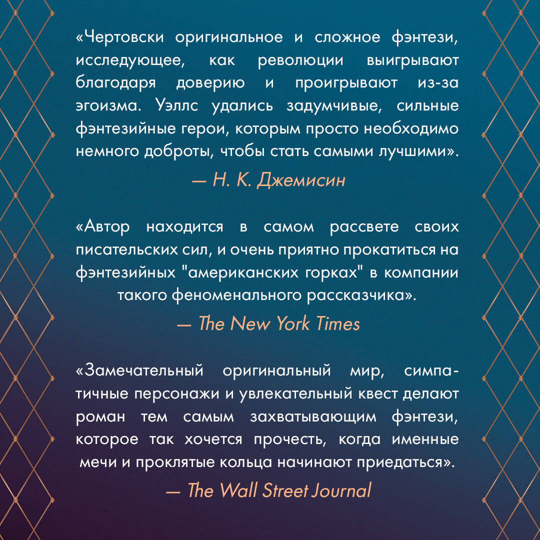 Премия Dragon Awards. Номинация Goodreads Choice Award. Бестселлер USA Today, Sunday Times, выбор LibraryReads, фэнтези года по версии New York Times. От суперзвезды фэнтези и автора «Дневников Киллербота», новая замечательная история о силе и дружбе, доверии и предательстве, а также о семьях, которые мы выбираем. Когда Король ведьм и принц Четвертого дома подземного мира Каистерон (или просто Каи для могущественных друзей и необычных родственников), просыпается и обнаруживает себя пленником в магической ловушке, первый вопрос, который у него возникает: как он вообще в нее попал? Узнав, что в ловушку также заключена ведьма Зиде, его ближайший союзник, Каи совершает эффектный побег не только из своих пут, но и из своего тела. Это не первый раз, когда он проделывает такой трюк. Мы узнаем об этом из хитро сплетенного повествования, которое объединит историю прошлого с захватывающими событиями настоящего. В число противников Каи входят владеющие магией толкователи, ужасающие монстры, надменные воины-арайки, коварные политики и невообразимо могущественные волшебники-чужеземцы, стремящиеся к мировому господству. Сбитый с толку, Каи оказывается в состоянии войны как со своей демонической природой, так и со своими врагами. Ему придется полагаться на старых союзников и недавно приобретенных друзей, чтобы разгадать все тайны своего врага. По мере того, как постепенно раскрывается заговор на самых высших уровнях Зарождающегося мира, империи, которую помог создать в свое время Каи, вопросов становится больше, чем ответов, а опасность неимоверно возрастает. «Король ведьм» - новый роман Марты Уэллс. Впервые более чем за десять лет она вернулась в жанр фэнтези, некогда сделавший ее одной из важнейших писательниц поколения. Фирменная способность Марты Уэллс как автора - создавать очаровательных персонажей, которые заставляют любить себя и с которыми мы себя идентифицируем, отправлять их в захватывающие приключения. «Автор находится в самом рассвете своих писательских сил, и очень приятно прокатиться на фэнтезийных "американских горках" в компании такого феноменального рассказчика». ― The New York Times «Замечательный оригинальный мир, симпатичные персонажи и увлекательный квест делают роман тем самым захватывающим фэнтези, которое так хочется прочесть, когда именные мечи и проклятые кольца начинают приедаться». ― The Wall Street Journal «Чертовски оригинальное и сложное фэнтези, исследующее, как революции выигрывают благодаря доверию и проигрывают из-за эгоизма. Уэллс удались задумчивые, сильные фэнтезийные герои, которым просто необходимо немного доброты, чтобы стать самыми лучшими». ― Н. К. Джемисин «Отличается от всего, что я когда-либо читала. Многослойный и сложный роман, который максимально оправдывает все ожидания от эпического фэнтези». ― Зорайда Кордова «Читатели фэнтези, ищущие новые миры и персонажей для исследования, будут в восторге». ― Library Journal| Издательство | ООО "Издательство "Эксмо" |