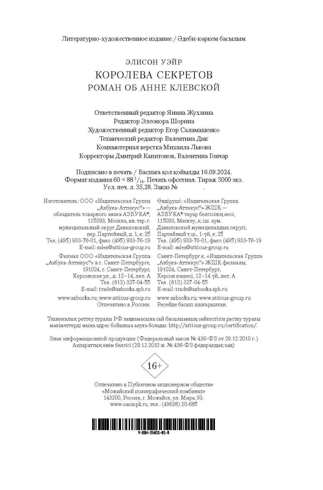 Недавно овдовевший Генрих VIII, собравшись в очередной раз жениться, решает взять в жены немецкую принцессу Анну Клевскую, которую никогда раньше не видел. Анна, не обладающая ни красотой, ни прочими женскими достоинствами, не вызывает у любвеобильного короля пылких чувств, но, руководствуясь государственными интересами, он все же вступает с ней в брак. Вскоре внимание Генриха VIII привлекает одна из фрейлин Анны, и король начинает искать повод для развода. В довершение всех бед одинокая, не признанная двором королева должна скрывать секреты, которые могут стоить ей жизни. Обвинит ли король Анну в прелюбодеянии, как несчастную Анну Болейн? Или с позором отправит домой? «Королева секретов. Роман об Анне Клевской» - это четвертая книга популярного автора и известного историка Элисон Уэйр, решившей создать драматическую серию, посвященную шести женам короля Генриха VIII.| Издательство | Азбука |