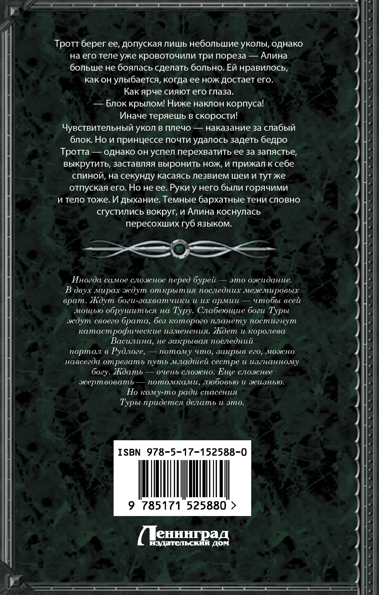 Иногда самое сложное перед бурей - это ожидание. В двух мирах ждут открытия последних межмировых врат. Ждут боги-захватчики и их армии - чтобы всей мощью обрушиться на Туру. Слабеющие боги Туры ждут своего брата, без которого планету постигнут катастрофические изменения. Ждет и королева Василина, не закрывая последний портал в Рудлоге, - потому что, закрыв его, можно навсегда отрезать путь младшей сестре и изгнанному богу. Ждать - очень сложно. Еще сложнее жертвовать - потомками, любовью и жизнью. Но кому-то ради спасения Туры придется делать и это.| Издательство | ИЗДАТЕЛЬСТВО "АСТ" |