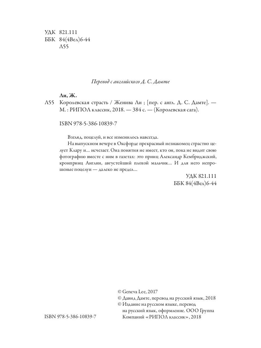 Взгляд, поцелуй, и все изменилось навсегда. На выпускном вечере в Оксфорде прекрасный незнакомец страстно целует Клару и... исчезает. Она понятия не имеет, кто он, пока не видит свою фотографию вместе с ним в газетах: это принц Александр Кембриджский, кронпринц Англии, августейший плохой мальчик... И для него непрошеные поцелуи - далеко не предел...| Издательство | Рипол Классик |