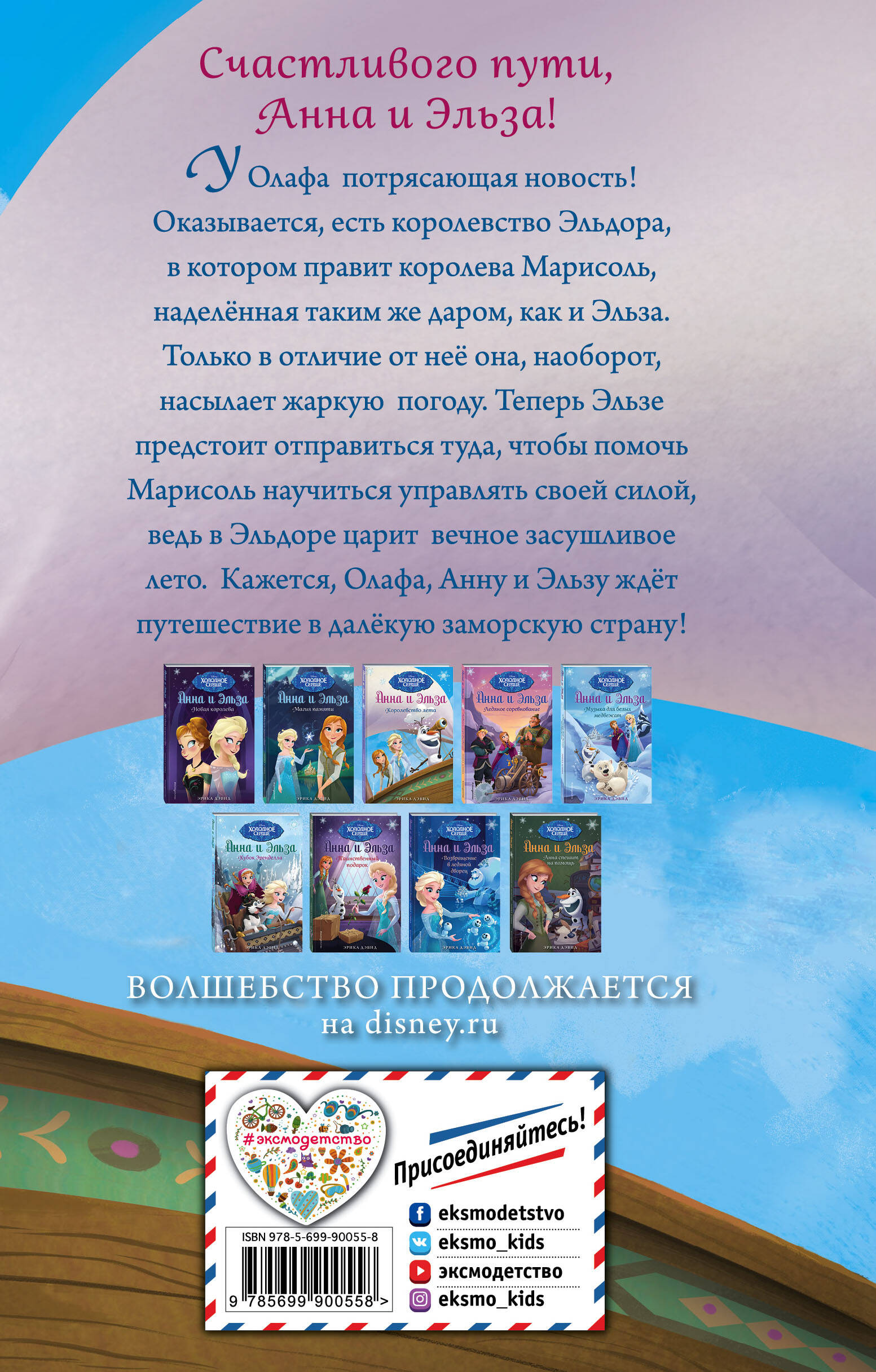 Счастливого пути, Анна и Эльза! У Олафа потрясающая новость! Оказывается, есть королевство Эльдора, в котором правит королева Марисоль, наделённая таким же даром, как и Эльза. Только в отличие от неё, она наоборот насылает жаркую погоду. Теперь Эльзе предстоит отправиться туда, чтобы помочь Марисоль научиться управлять своей силой, ведь в Эльдоре царит вечное засушливое лето. Кажется, Олафа, Анну и Эльзу ждёт путешествие в далёкую заморскую страну!| Издательство | ООО "Издательство "Эксмо" |