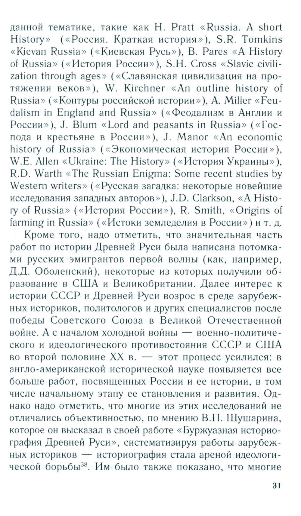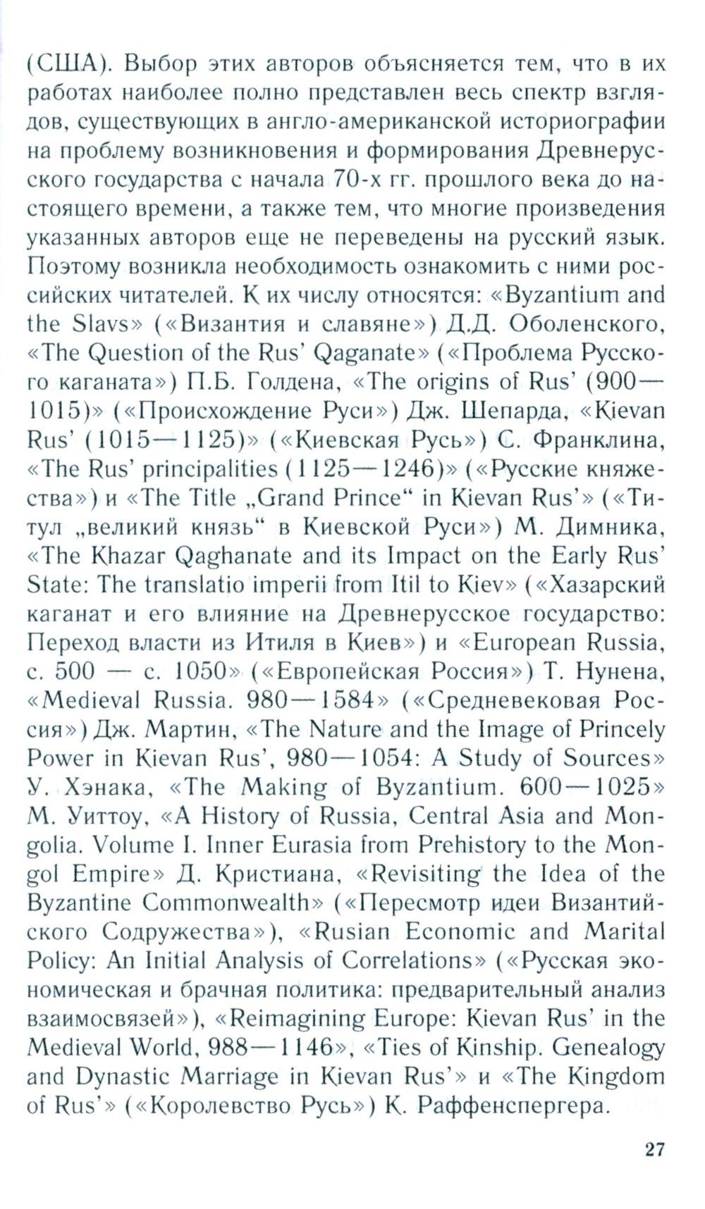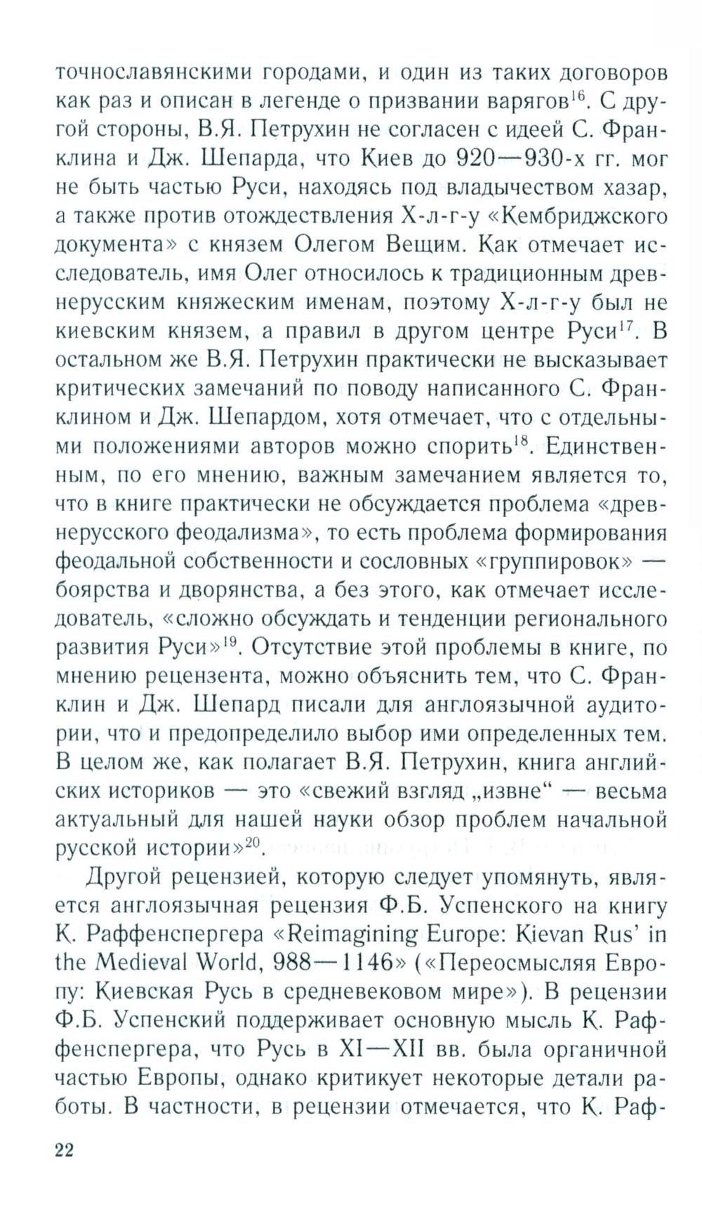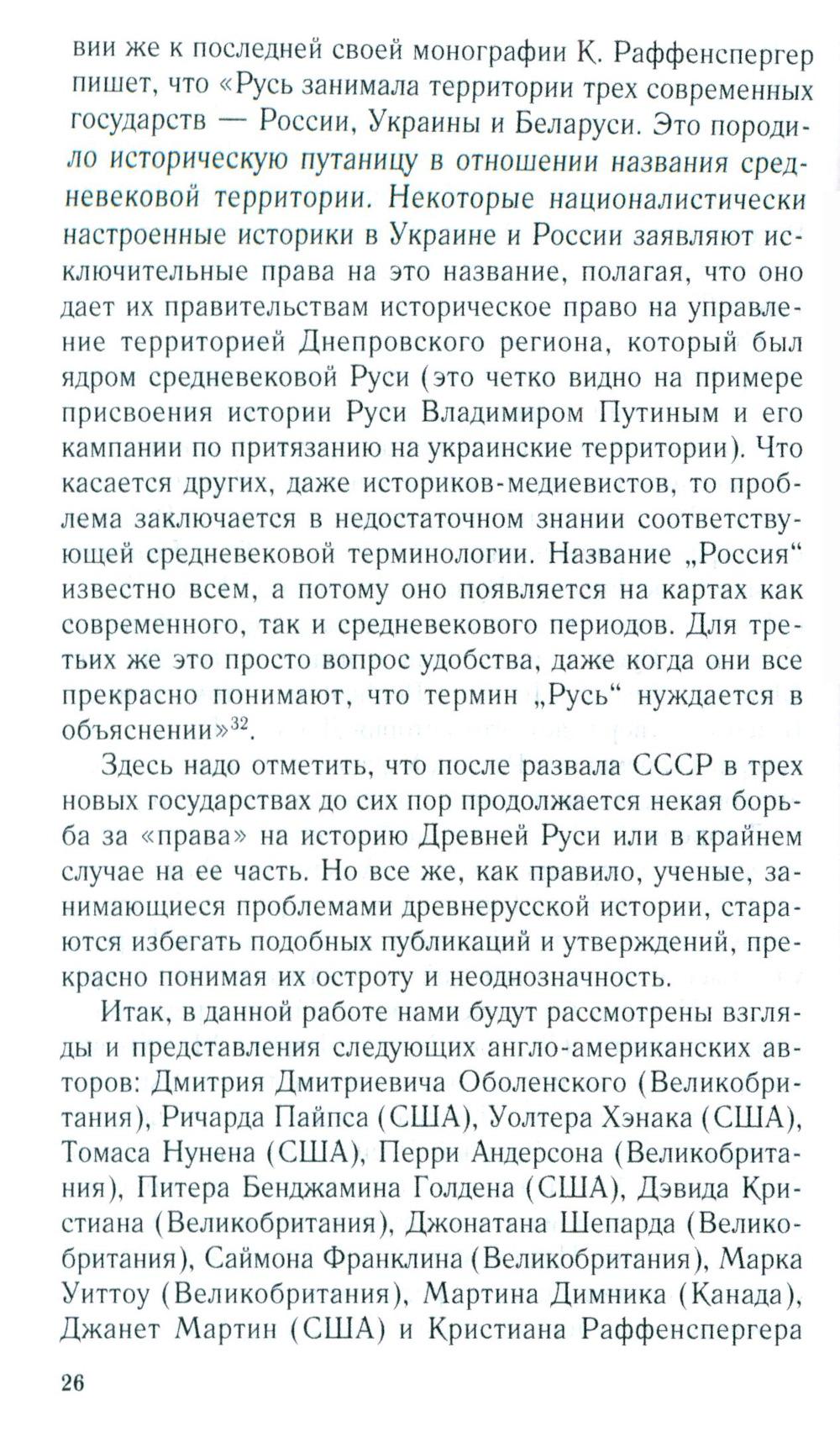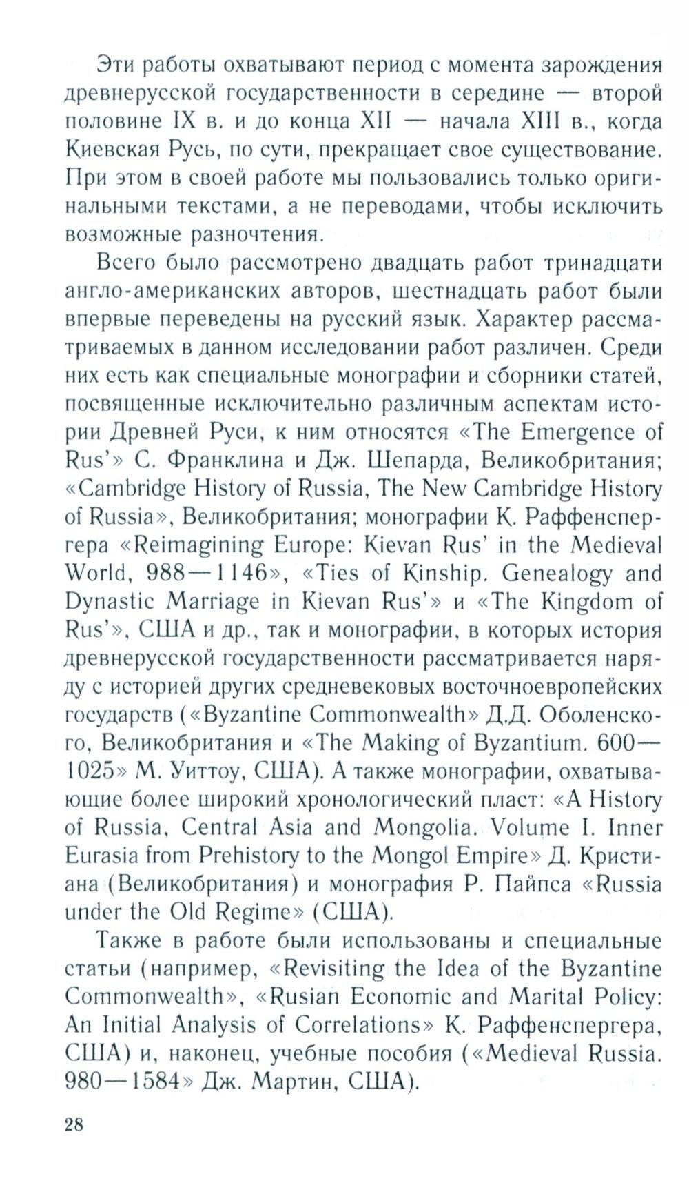 Первая часть книги - это анализ новейшей англо-американской литературы по проблемам древнерусской государственности середины IX- начала XII в., которая мало известна не только широкому российскому читателю, но и специалистам в этой области, т. к. никогда не издавалась в России. Российским историком А.В. Федосовым рассмотрены наиболее заметные работы англо-американских авторов, вышедшие с начала 70-х годов прошлого века до настоящего времени. Определены направления развития новейшей русистики и ее научные достижения. Вторая часть представляет собой перевод работы «Королевство Русь» профессора Виттенбергского университета (США) Кристиана Раффенспергера - одного из авторитетных современных исследователей Древней Руси. Основной идеей книги является тезис о том, что Русь, по крайней мере до XIII в., была неотъемлемой частью общеевропейской культурно-политической общности благодаря династическим союзам, культурным контактам, религиозному взаимодействию и т. д. Представлен оригинальный взгляд автора на проблему титулатуры древнерусских правителей и ее аналогии с западноевропейскими титулами.| Издательство | Центрполиграф |