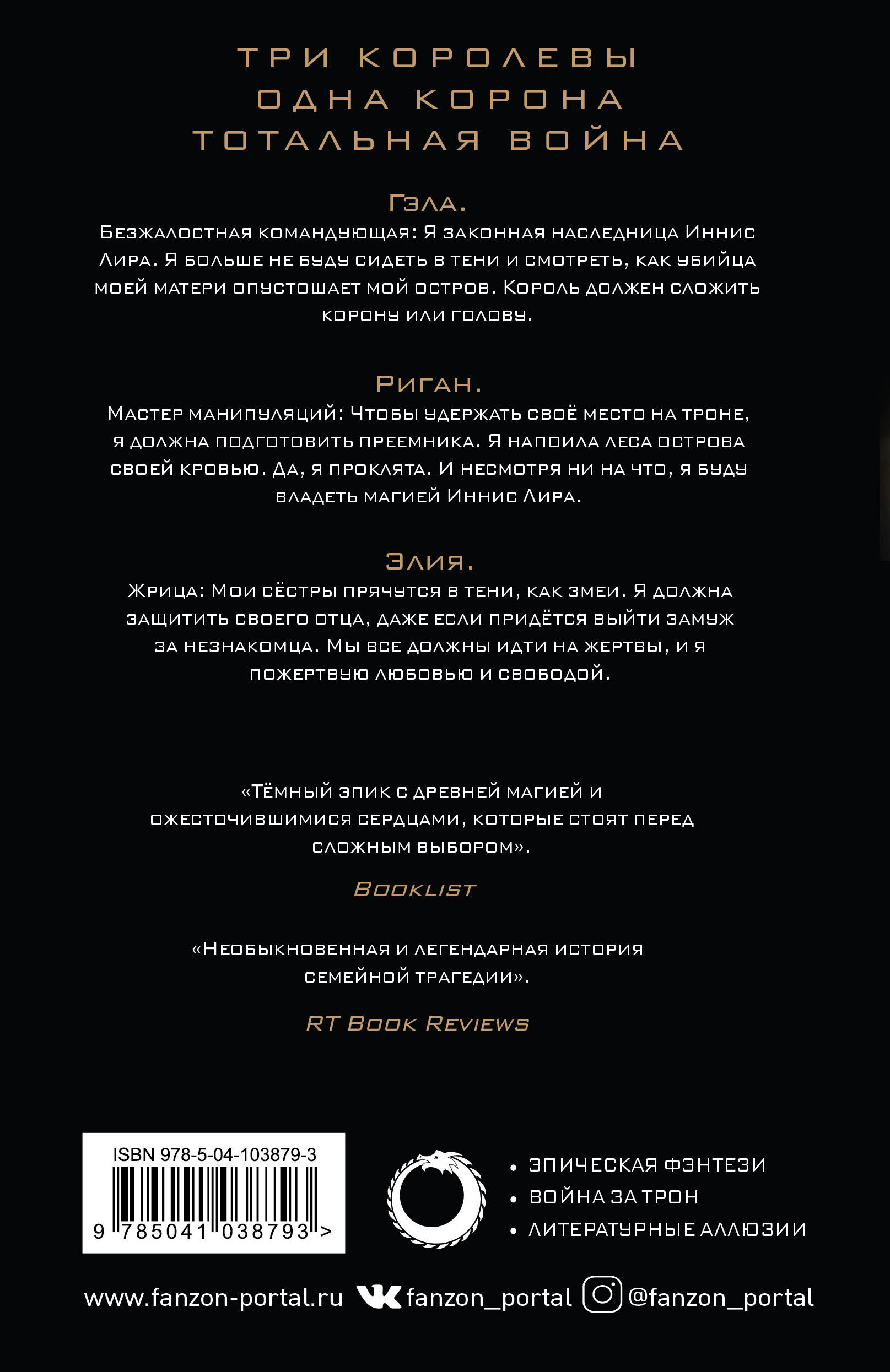Лис Бан, графский бастард, маг, сын ведьмы Белого леса, влюблен в королевскую дочь. Изгнанный и ведомый обидой, он решает отомстить. Безутешный король Лир, потеряв жену, доверяет лишь пророчествам звезд. Решив передать власть, он созывает трех дочерей. Та, что любит его сильнее, станет королевой. Но судьба решает иначе, и королевство оказывается втянуто в распри между мужьями старших дочерей, рвущихся к короне, но она ядовита, а истинную королеву выберет волшебный остров Иннис Лир. Корни его шепчущихся деревьев вплелись в прочные камни скал, а ветер говорит с теми, кто умеет слушать. «Темный эпик с древней магией и ожесточившимися сердцами, которые стоят перед сложным выбором». - Booklist «Необыкновенная и легендарная история семейной трагедии». - RT Book Reviews| Издательство | ООО "Издательство "Эксмо" |