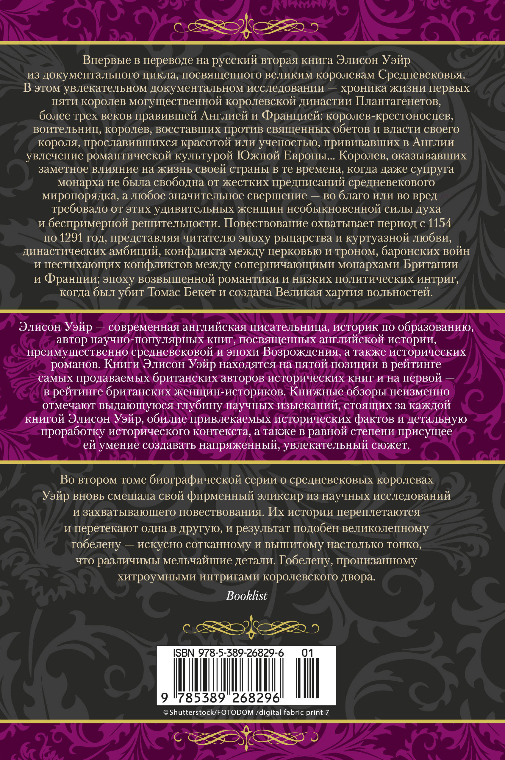 Вторая книга Элисон Уэйр из документального цикла, посвященного великим королевам Средневековья. В этом увлекательном документальном исследовании - хроника жизни первых пяти королев могущественной королевской династии Плантагенетов, более трех веков правившей Англией и Францией: королев-крестоносцев, воительниц, королев, восставших против священных обетов и власти своего короля, известных красотой или ученостью, прививавших в Англии увлечение романтической культурой Южной Европы… Королев, оказывавших заметное влияние на жизнь своей страны в те времена, когда даже супруга монарха не была свободна от жестких предписаний средневекового миропорядка, а любое значительное свершение - во благо или во вред - требовало от этих удивительных женщин необыкновенной силы духа и беспримерной решительности. Повествование охватывает период с 1154 по 1291 год, представляя читателю эпоху рыцарства и куртуазной любви, династических амбиций, конфликта между церковью и троном, баронских войн и не стихающих конфликтов между соперничающими монархами Британии и Франции; эпоху возвышенной романтики и низких политических интриг, когда был убит Томас Беккет и создана Великая хартия вольностей.
