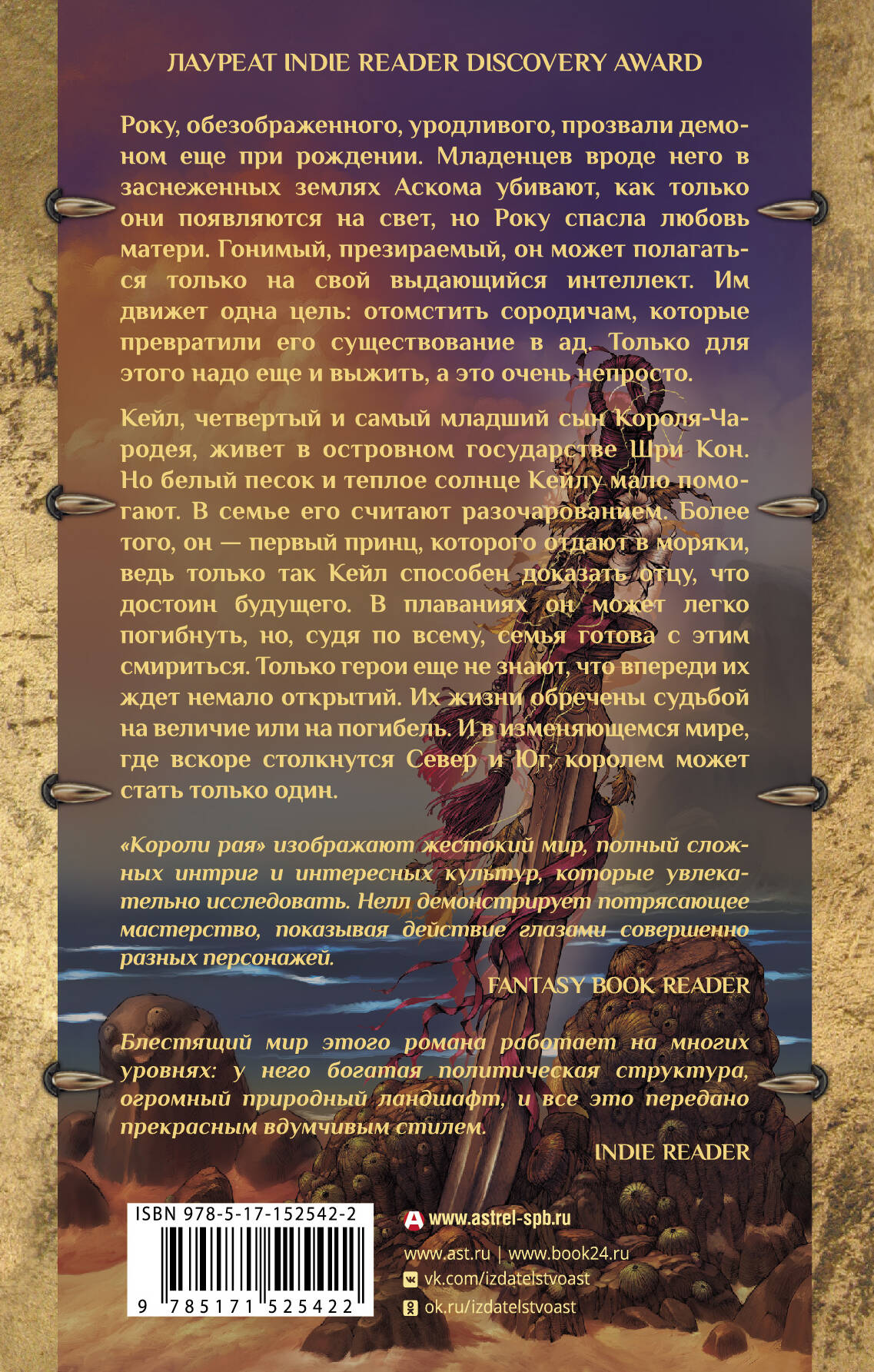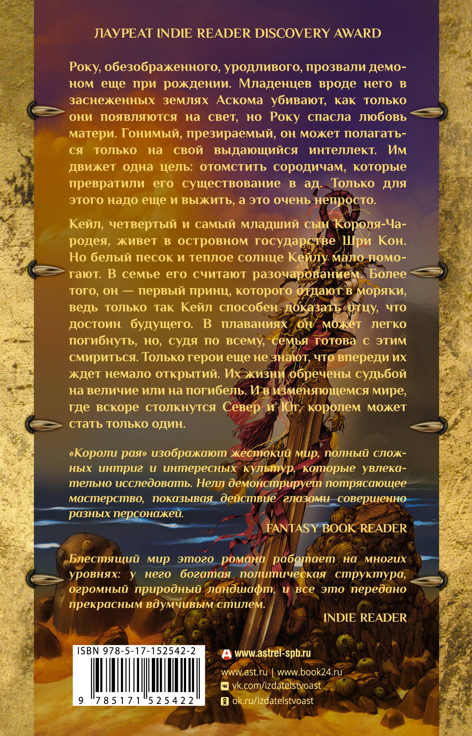 Впервые на русском языке. Первая книга трилогии «Пепел и песок». Для всех поклонников мрачного и реалистичного фэнтези в стиле Джорджа Мартина и Джо Аберкромби. Глубокое синее море разделяет два мира - покрытые снегом пустоши Аскома, где живут жестокие люди с суровыми законами, и королевство Шри-Кон, кажущееся раем на земле. Между Рукой и Кале пролегает целая пропасть: один родился уродливым ребёнком-демоном, чудом избежавшим смерти, другой же - младший сын Короля-Чародея, изнеженный и избалованный. Потеряв мать, Руки встаёт на путь мести, который ведёт его к войне с Шри-Кон. В это же время отец отправляет Кале на морскую службу, чтобы сделать из сына мужчину. Теперь Кале должен доказать свою ценность и отцу, и самому себе. А между тем райское королевство вот-вот столкнётся с миром жестокой снежной пустыни…| Издательство | Издательство "АСТ" |