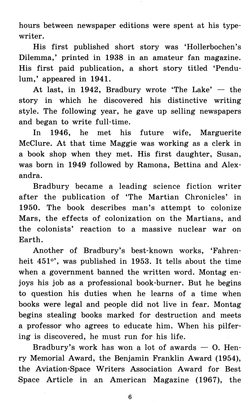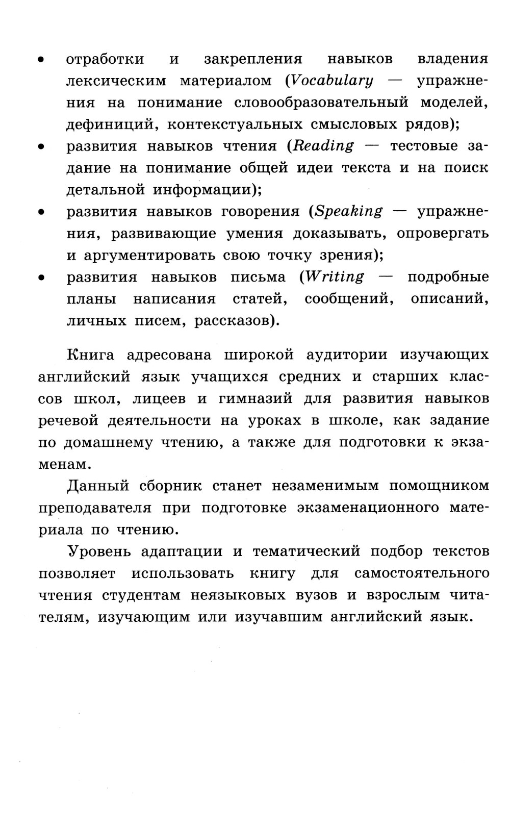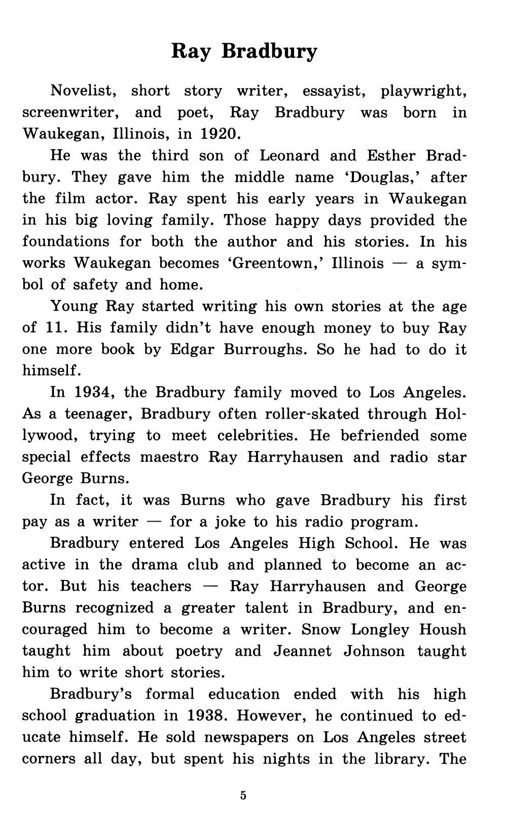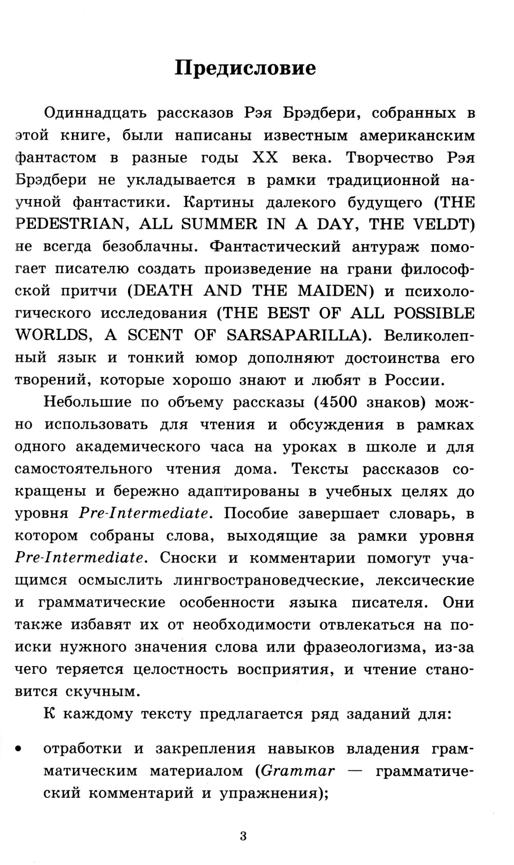 Книга представляет собой сборник рассказов известного американского писателя-фантаста Рэя Брэдбери. Короткие рассказы Брэдбери являются признанными шедеврами современной литературы. Не умаляя значения его крупных произведений, стоит признать, что именно в этой форме литературного творчества писатель достиг вершины мастерства. Их стиль - стремительная, эмоциональная зарисовка, необычайно яркая и оригинальная, необычные запоминающиеся сюжеты и тонкий психологизм в раскрытии образов героев. Тексты рассказов адаптированы в учебных целях до уровня Рrе-Intermediate и сопровождаются комментарием, а также заданиями для отработки и закрепления навыков владения грамматическим и лексическим материалом. В конце пособия приводится англо-русский словарь. Книга адресована учащимся 7-8 классов школ, лицеев, гимназий и всем изучающим английский язык.| Издательство | Айрис-Пресс |