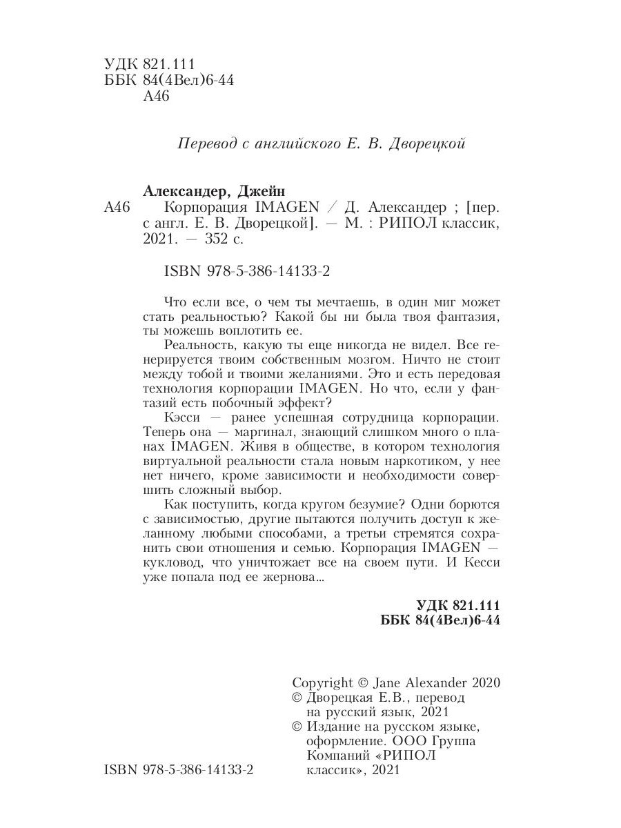 Что если все, о чем ты мечтаешь, в один миг может стать реальностью? Какой бы ни была твоя фантазия, ты можешь воплотить ее. Реальность, какую ты еще никогда не видел. Все генерируется твоим собственным мозгом. Ничто не стоит между тобой и твоими желаниями. Это и есть передовая технология корпорации IMAGEN. Но что, если у фантазий есть побочный эффект? Кэсси - ранее успешная сотрудница корпорации. Теперь она - маргинал, знающий слишком много о планах IMAGEN. Живя в обществе, в котором технология виртуальной реальности стала новым наркотиком, у нее нет ничего, кроме зависимости и необходимости совершить сложный выбор. Как поступить, когда кругом безумие? Одни борются с зависимостью, другие пытаются получить доступ к желанному любыми способами, а третьи стремятся сохранить свои отношения и семью. Корпорация IMAGEN - кукловод, что уничтожает все на своем пути. И Кесси уже попала под ее жернова…| Издательство | Рипол Классик |