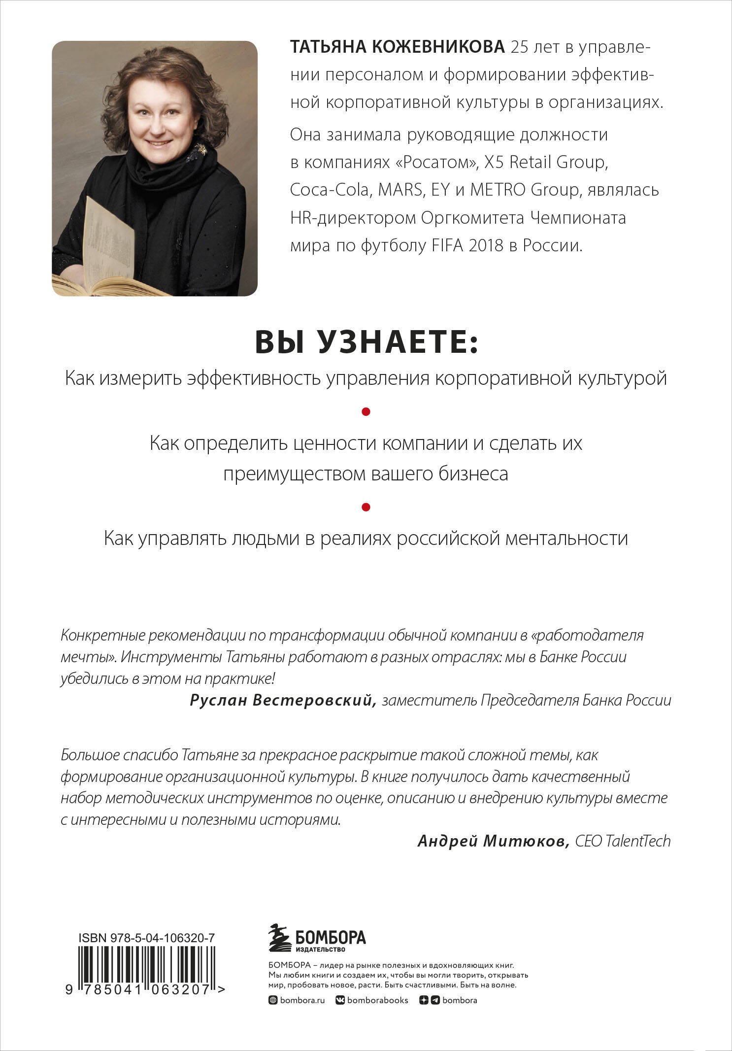 Татьяна занимала руководящие должности в компаниях: Госкорпорация «Росатом», Х5 Retail Group, Coca-Cola, MARS, EY, METRO Group, являлась HR-директором Оргкомитета Чемпионата мира по футболу FIFA 2018 г. в России. Татьяна читает лекции в бизнес-школах и выступает на конференциях, посвященных развитию человеческого капитала и эффективности организации. В книге есть ответы на вопросы: - Как измерить эффективность управления корпоративной культурой; - Как управлять людьми в реалиях российской ментальности; - Как определить ценности компании и сделать их преимуществом вашего бизнеса. «Конкретные рекомендации по трансформации обычной компании в "работодателя мечты". Инструменты Татьяны работают в разных отраслях: мы в Банке России убедились в этом на практике!» - Руслан Верестовский, заместитель Председателя Банка России| Издательство | ООО "Издательство "Эксмо" |