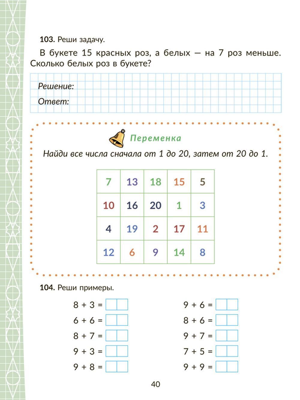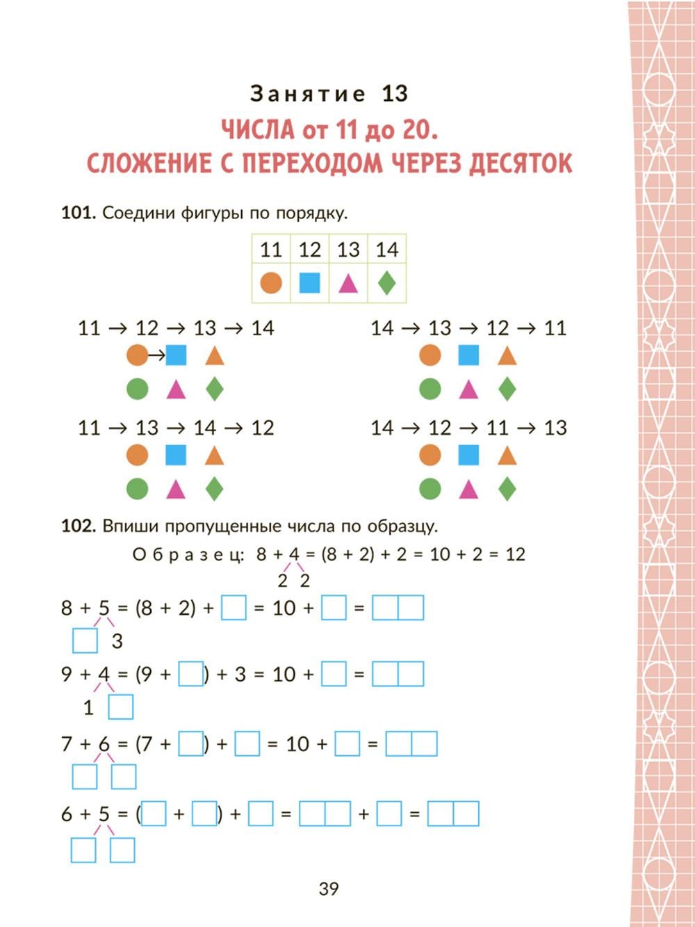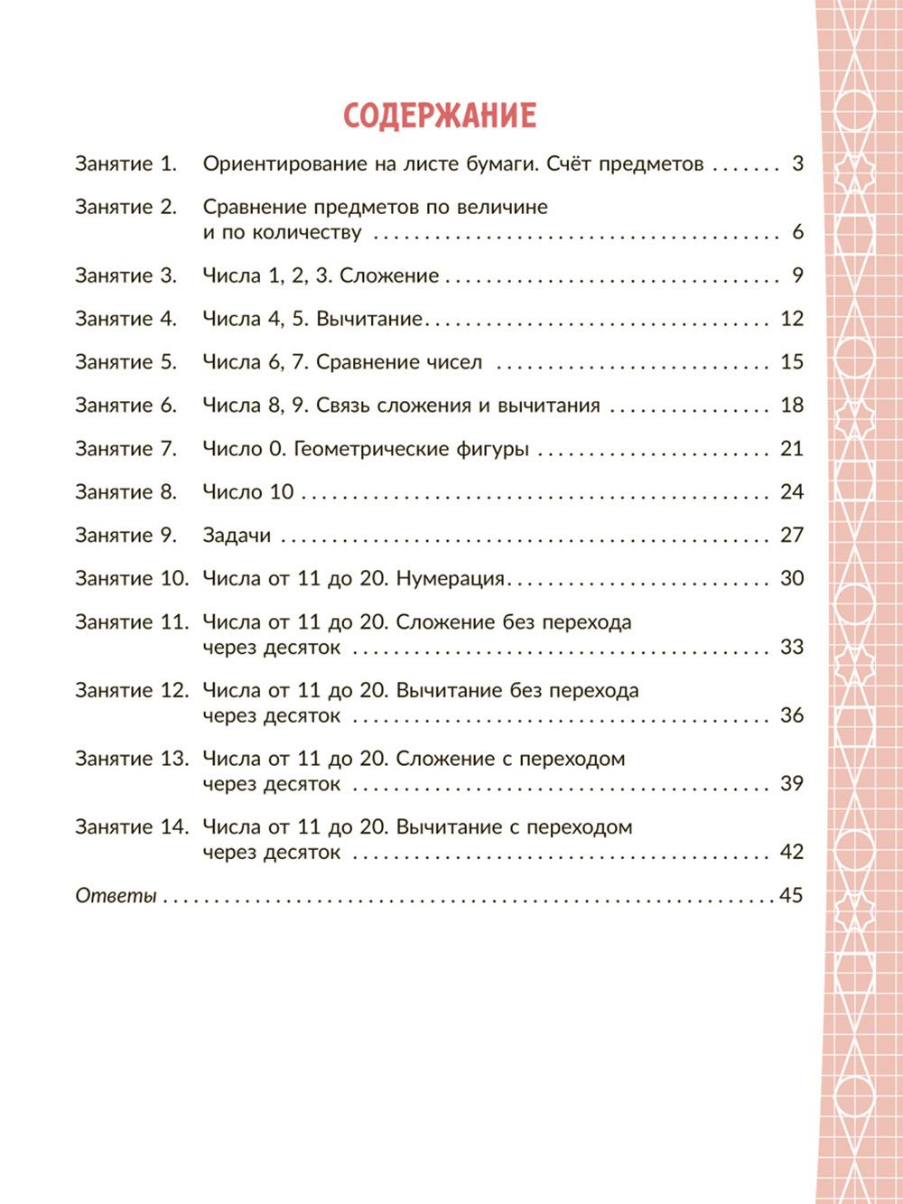Книга направлена на формирование и развитие базовых математических навыков, необходимых для успешного усвоения учебной программы 1-го класса. Выполняя разнообразные интересные упражнения с опорой на яркие иллюстрации, ребёнок научится считать от 1 до 20, выполнять арифметические действия сложения и вычитания, сравнивать числа, решать простые задачи, утверждённые школьной программой. Типовые задания по математике сопровождаются нейропсихологическими упражнениями, направленными на повышение уровня внимания, зрительной памяти, развитие наглядно-образного мышления и пространственных представлений. Задания в рубрике «Переменка» позволят школьнику отдохнуть от выполнения заданий и, при этом способствуя развитию слухомоторной и зрительной координации. К заданиям в рабочей тетради приведены ответы. Книга поможет школьнику быстро и легко усвоить учебный материал и повысит его интерес к учебному предмету.| Издательство | ИД ЛИТЕРА |