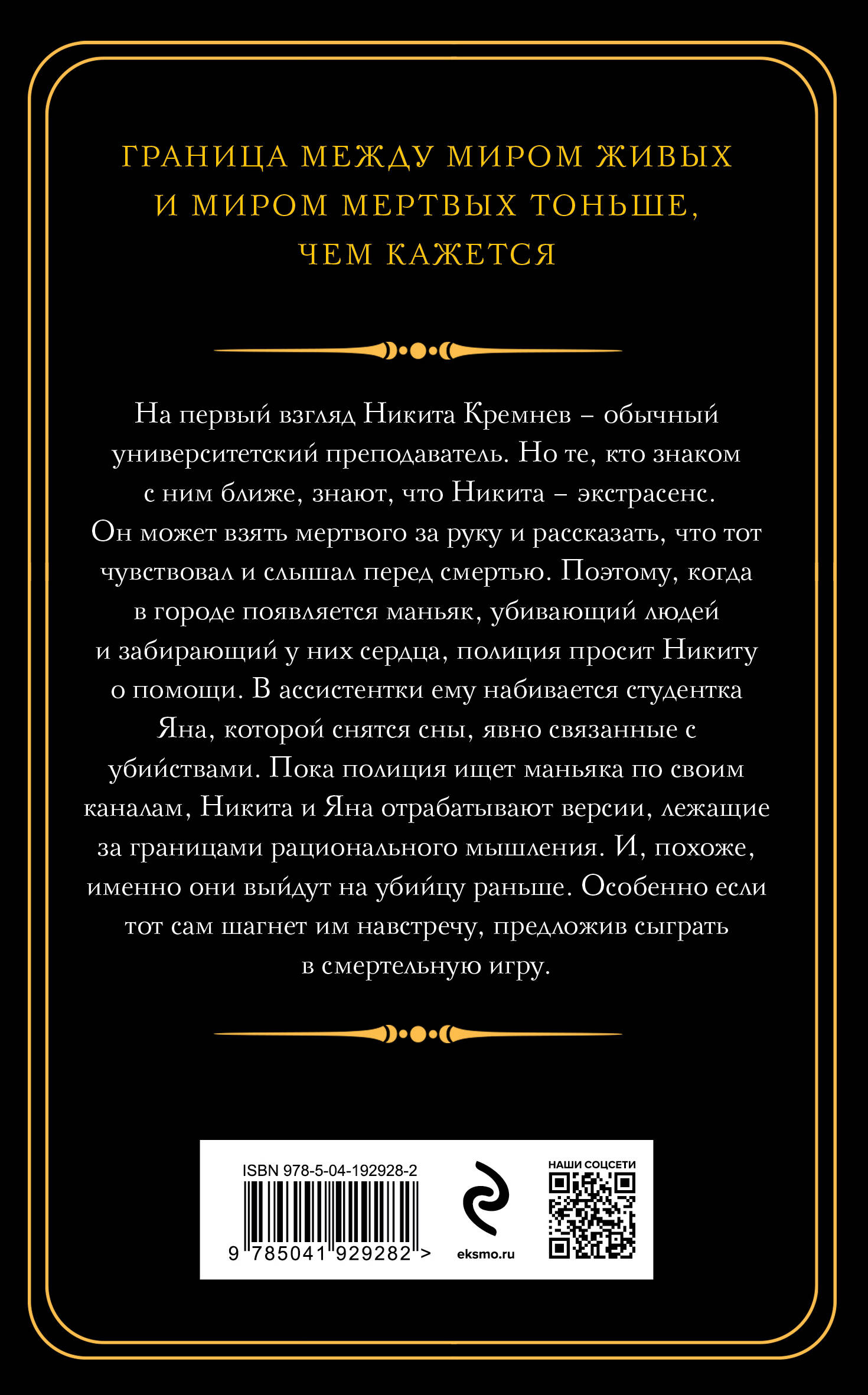 Захватывающее детективное фэнтези, увлекающее с первой страницы. Романы Натальи Тимошенко пропитаны мистикой и тайной. В них оживают лесные чудовища, посланники из мира мертвых и старые добрые домовые. На первый взгляд Никита Кремнев - обычный университетский преподаватель. Но те, кто знаком с ним ближе, знают, что Никита - экстрасенс. Он может взять мертвого за руку и рассказать, что тот чувствовал и слышал перед смертью. Поэтому, когда в городе появляется маньяк, убивающий людей и забирающий у них сердца, полиция просит Никиту о помощи. В ассистентки ему набивается студентка Яна, которой снятся сны, явно связанные с убийствами. Пока полиция ищет маньяка по своим каналам, Никита и Яна отрабатывают версии, лежащие за границами рационального мышления. И, похоже, именно они выйдут на убийцу раньше. Особенно если тот сам шагнет им навстречу, предложив сыграть в смертельную игру.| Издательство | ООО "Издательство "Эксмо" |