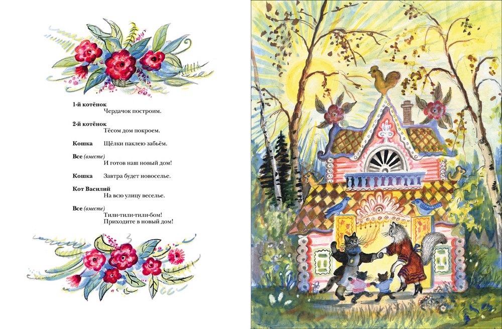 Финал, как и положено в детской сказке, - счастливый. Готов новый «пряничный», расписной васнецовский домик, ярко светит в небе солнце, кошка и котята водят хоровод, распустились на страницах книги пышные красные цветы.