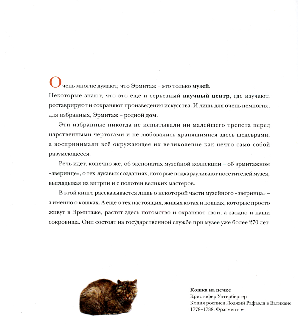 Наши кошки очень любят Эрмитаж, больше, чем некоторые люди. Поэтому мы их особо ценим, ведь они привлекают посетителей в музей. В последнее время у меня чаще просят интервью о кошках, чем о картинах Рембрандта. И нам временно приходится с этим мириться. Ведь благодаря кошкам в людях, которые работают в Эрмитаже, и в людях, которые приходят в Эрмитаж, пробуждается любовь к животным и понимание того, что животных надо оберегать и спасать. Коты стали важной частью нашей эрмитажной жизни и одной из наших знаменитых эрмитажных легенд. О них рассказывают очень много как правдивых, так и вымышленных историй, но там, где живут кошки, правда и вымысел всегда перемешиваются и возникают музейные сказки. На свете существует не так уж много музейных мест, где кошкам тоже живется хорошо. Среди них, например, Британский музей; там у кошек есть даже специальные домики, у нас такие только планируются. Я надеюсь, что юные читатели помогут нам когда-нибудь построить удобные и элегантные домики, и они будут не хуже, чем Дом, который построил для нас Растрелли. М. Б. Пиотровский Директор Государственного Эрмитажа| Издательство | Арка |