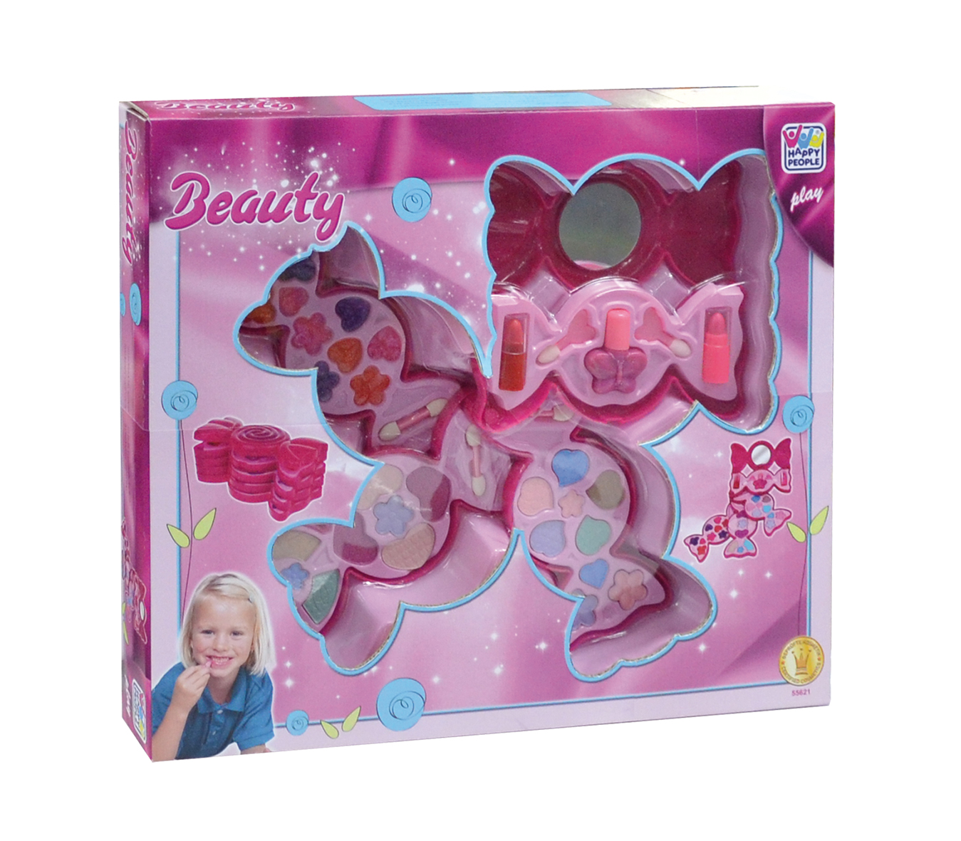 Компания Happy People была основана в Бермене в 1965 году. Широкий ассортимент продукции включает как успешные бренды, так и лицензионные марки. Все продукты тщательно проверяются на качество и функциональность. Этот набор косметики идеально подходит для маленькой девочки, которая ценит красоту и красивый макияж. В набор входят зеркало, подводка для губ, помада разных цветов, лак для ногтей, аппликатор для нанесения помады и кисточка. Косметический набор имеет форму конфеты и различные уровни.