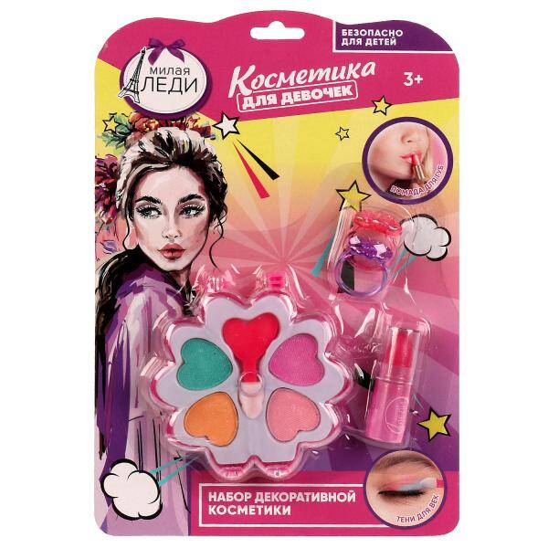 Набор косметики для девочек ТМ "Милая леди" непременно понравится маленькой моднице: - тени для век - помада для губ - 2 кольца - аппликатор для нанесения макияжа - безопасно для детей Девочки в любом возрасте хотят быть красивыми. Специально для юных модниц был разработан этот набор, состоящий из теней для век, помады для губ и стильных аксессуаров. Маленькая принцесса обязательно оценит красочные цвета и модную упаковку. Развивайте чувство стиля и вкуса, учите девочку создавать свой неповторимый образ вместе с косметикой ТМ "Милая леди". Размер: 13 х 20 х 2 см. Материал косметики: полимер. Материал аксессуаров: пластик. Материал упаковки: пластик + картон. Цвета и оттенки могут варьироваться в зависимости от наполнения набора. Рекомендовано детям от 3-х лет.