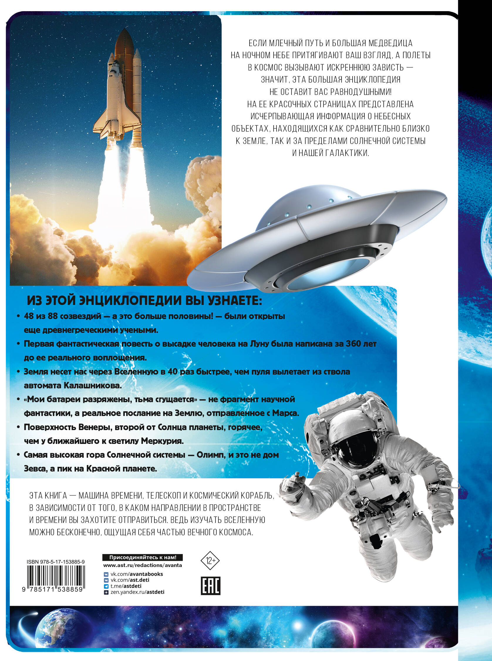 Тысячи лет звездное небо приковывало взгляды людей и становилось объектом пристального внимания исследователей. И пусть не все гипотезы ученых подтвердились, все же отчасти и благодаря им изучение космоса достигло небывалых высот. Настоящее издание - сборник исчерпывающих астрономических и астрофизических знаний, накопленных человечеством с древнейших времен до наших дней. Книга содержит звездные карты и календари древних народов, ключевые фрагменты биографий знаменитых астрономов, информацию о появлении и развитии приборов, снаряжения и техники для освоения космоса и, конечно же, фотоснимки звезд, комет, туманностей и других небесных тел, сделанные с бортов орбитальных станций и других летательных аппаратов, а также с поверхности Луны. Эта большая энциклопедия станет "космическим кораблем" для каждого, кто готов бесконечно смотреть на звезды и разгадывать тайны непостижимой и необъятной Вселенной. Для среднего и старшего школьного возраста.| Издательство | ИЗДАТЕЛЬСТВО "АСТ" |