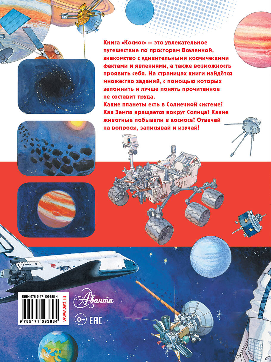 Книга "Космос" - это увлекательное путешествие по просторам вселенной, знакомство с удивительными космическими фактами и явлениями, а также возможность проявить себя. На страницах книги найдётся множество заданий, с помощью которых запомнить и лучше понять прочитанное не составит труда. Какие планеты есть в Солнечной системе? Как Земля вращается вокруг Солнца? Какие животные побывали в космосе? Отвечай на вопросы, записывай и изучай!| Издательство | ИЗДАТЕЛЬСТВО "АСТ" |