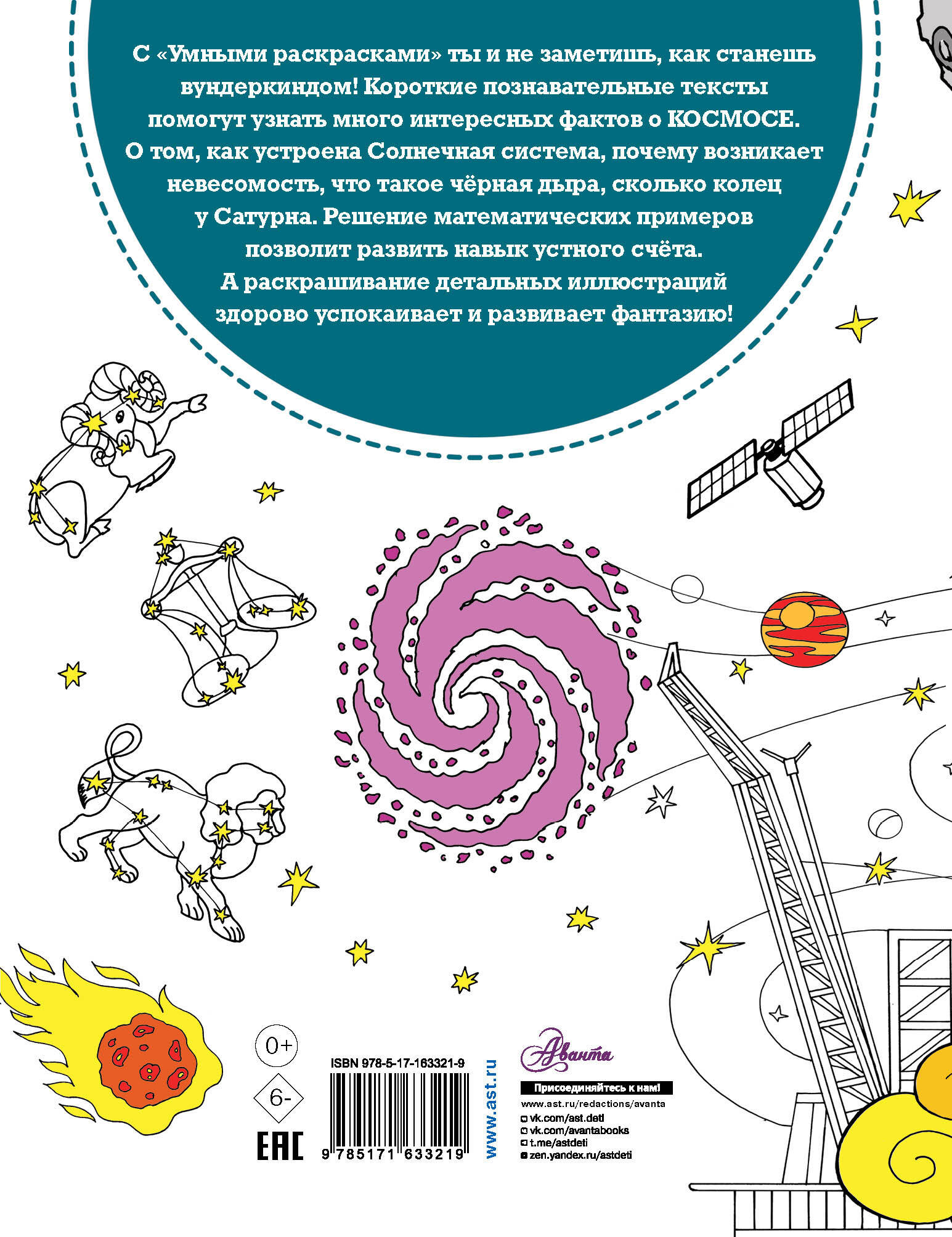 Эта книга - не просто раскраска, а самая настоящая маленькая энциклопедия, которая познакомит ребёнка с интересными фактами о космосе, расскажет, как разные народы представляли себе устройство Земли, какие бывают галактики, сколько планет в Солнечной системе, что такое квазар и чёрная дыра, какие бывают созвездия. Ребёнок сможет раскрасить подробные иллюстрации и попутно потренировать навык устного счёта, ведь на каждом развороте есть математические примеры, которые помогут выбрать нужный цвет. Для младшего школьного возраста.| Издательство | Издательство "АСТ" |