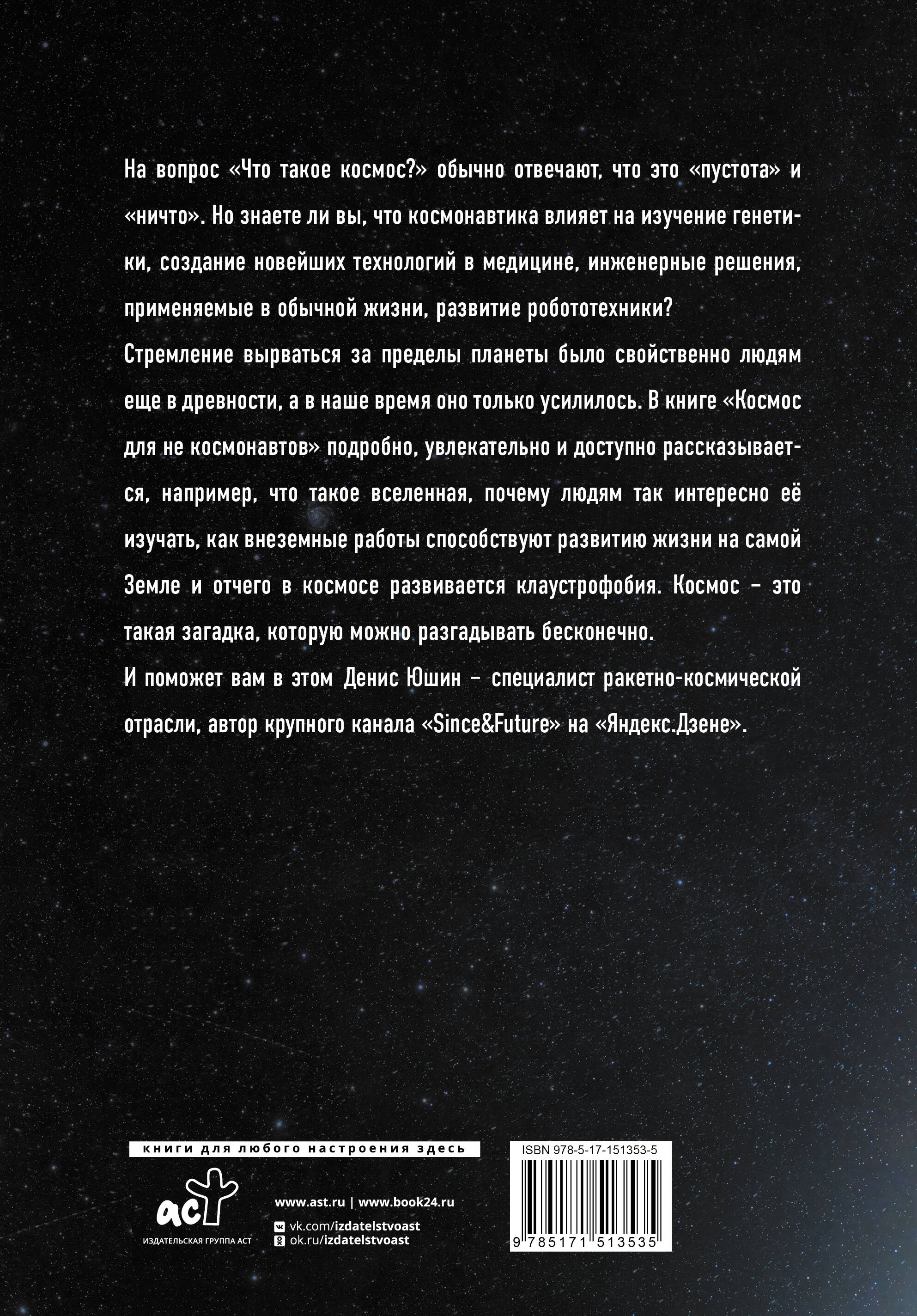 На вопрос "Что такое космос?" обычно отвечают, что это "пустота" и "ничто". Но знаете ли вы, что космонавтика влияет на изучение генетики, создание новейших технологий в медицине, инженерные решения, применяемые в обычной жизни, развитие робототехники? Стремление вырваться за пределы планеты было свойственно людям еще в древности, а в наше время оно только усилилось. В книге "Космос для не космонавтов" подробно, увлекательно и доступно рассказывается, например, что такое вселенная, почему людям так интересно её изучать, как внеземные работы способствуют развитию жизни на самой Земле и отчего в космосе развивается клаустрофобия. Космос - это такая загадка, которую можно разгадывать бесконечно. И поможет вам в этом Денис Юшин - специалист ракетно-космической отрасли, автор крупного канала "Science&Future" на "Яндекс.Дзене".| Издательство | ИЗДАТЕЛЬСТВО "АСТ" |