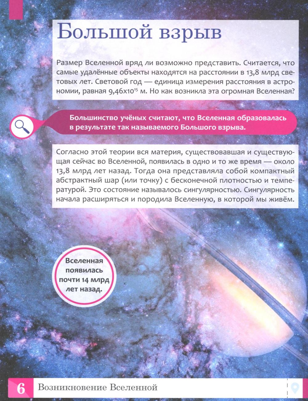 Книга посвящена нашей бесконечной Вселенной. Вы узнаете о её возникновении, о галактиках, звёздах и планетах, о кометах и астероидах, о загадочной тёмной материи и чёрных дырах. Красивые иллюстрации помогут разобраться в многообразии космических объектов и не потеряться на просторах Вселенной.| Издательство | Феникс |