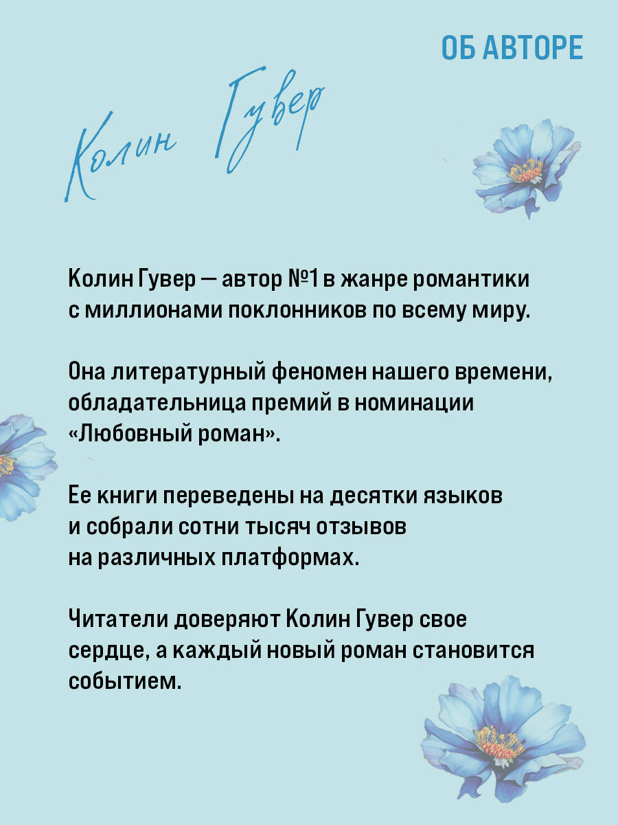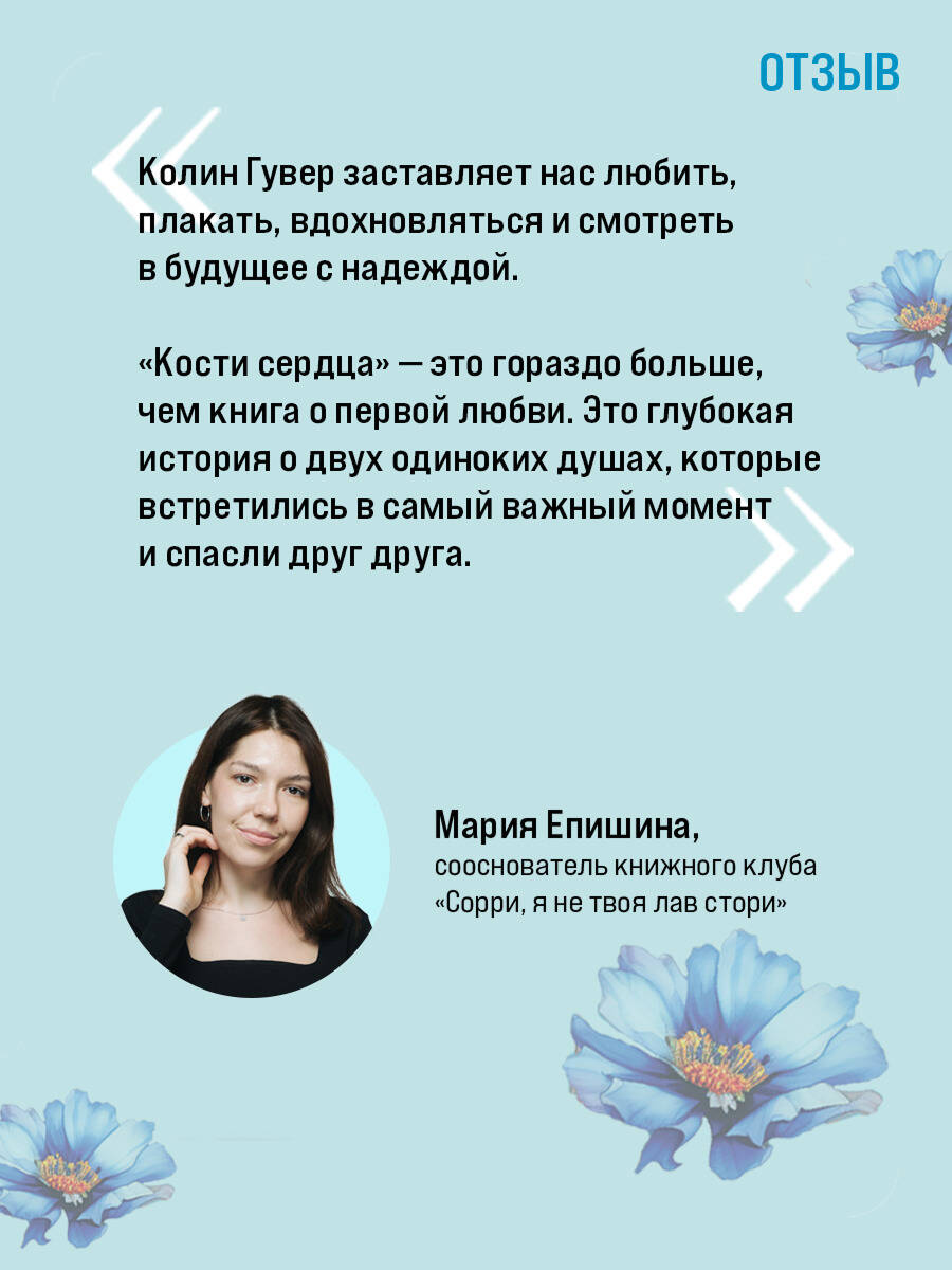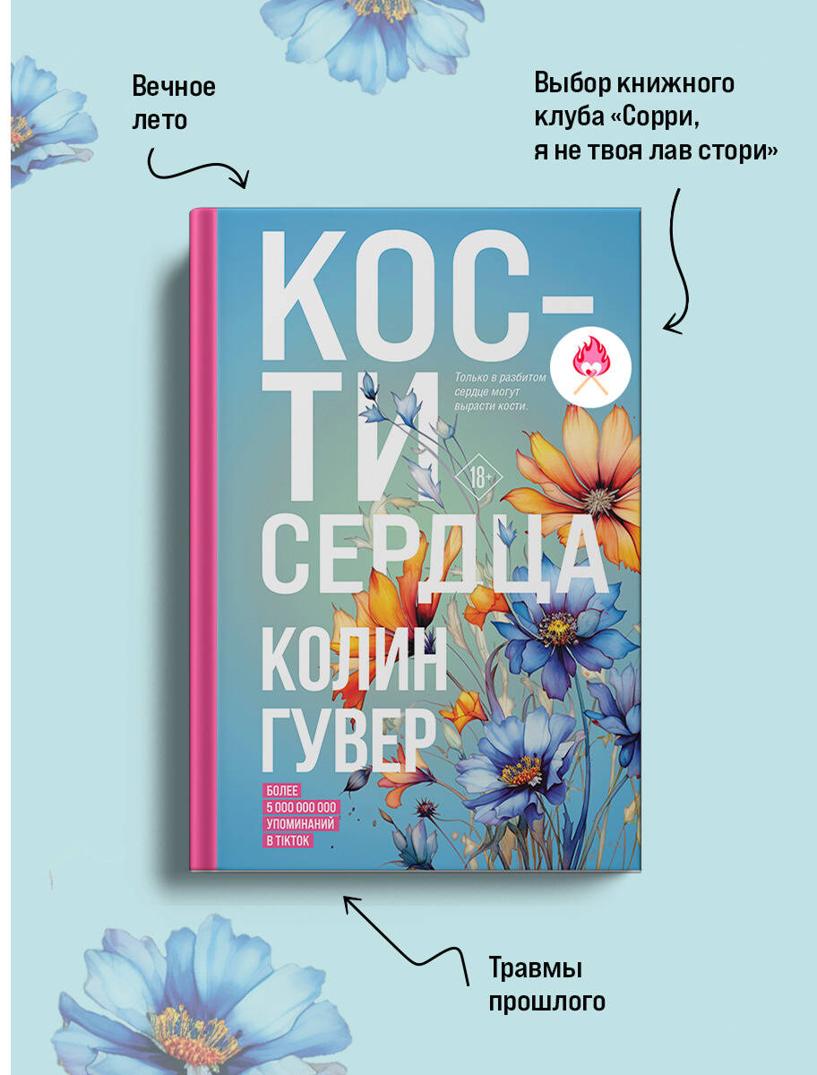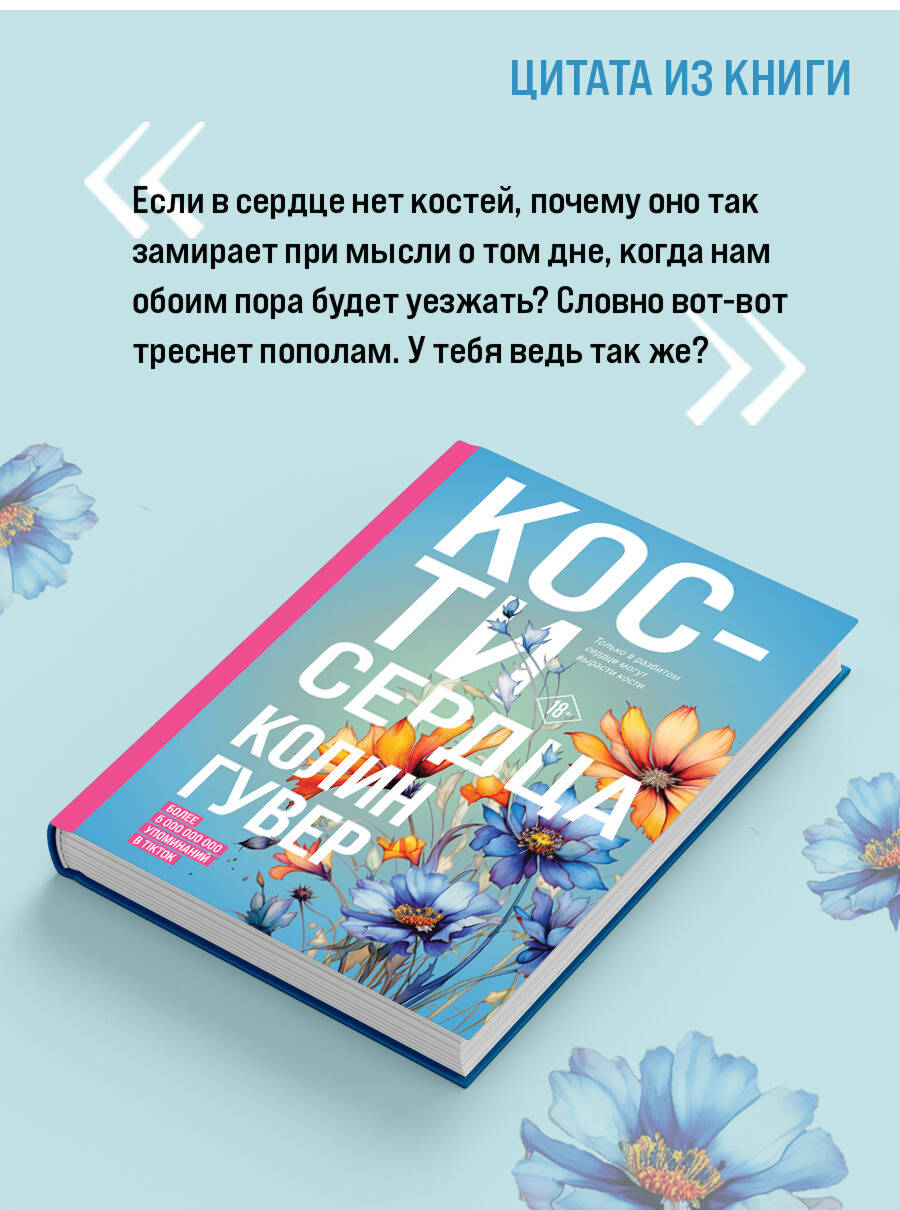 Колин Гувер - автор, которому читатели доверяют свое сердце. Ее истории доказывают: даже растоптанный цветок однажды может прорасти, чтобы стать ближе к солнцу. Более 3 000 000 000 просмотров в TikTok. Колин Гувер - литературный феномен нашего времени, троекратная обладательница премии Goodreads Choice Award в номинации «Любовный роман». Ее произведения переведены на десятки языков. Она - мировой тренд. Продажи книг Колин Гувер превысили продажи Стивена Кинга и Джорджа Мартина. «Кости сердца» - долгожданная новинка любимого автора, с которой ваше лето будет вечным. Вертушка - главный символ этой книги. Бейя, главная героиня, выбрала изображение урагана в качестве памятной татуировки, а Самсон выбрал вертушку. На обеих татуировках героев запечатлено вращение. У нее - разноцветный вихрь. У него - изящный и яркий образ. Таким было их лето. Таким оно и останется с ними. Навсегда. «Возможно, он просто не понимает, как много для меня значит. Мне ни капли не страшно узнать о нем всю правду». Бейя Грим прекрасно играет в волейбол, благодаря чему поступает в университет. Впереди долгое лето, и, чтобы не сидеть без дела, девушка решает устроиться на работу. Неожиданное событие путает все планы Бейи, и она уезжает в Техас к отцу. Несмотря на скрытный и нелюдимый нрав Бейи, новая семья отца тепло принимает девушку. А еще Бейя знакомится с Самсоном, красивым задумчивым парнем из богатой семьи, живущей в соседнем доме. С каждым днем герои лучше узнают друг друга и понимают: связь между ними слишком сильна, чтобы ее игнорировать. Лето подходит к концу, но разве оно может закончиться, если в сердце наступила весна? «Это гораздо больше, чем трогательная книга о первой любви. Это история об одиночестве, потерях, страхе за будущее и надежде. Колин Гувер заставляет испытывать весь спектр чувств вплоть до последней страницы». - Ольга Саленко, шеф-редактор сайта Grazia| Издательство | ООО "Издательство "Эксмо" |