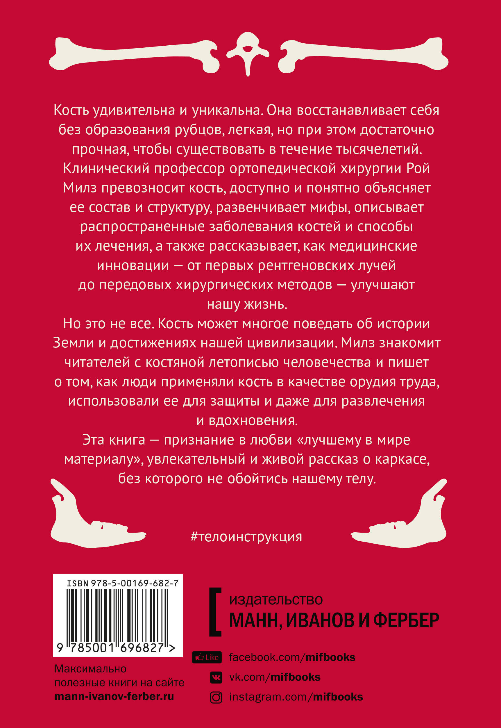 Живой иллюстрированный рассказ о 500 миллионах лет истории кости - краеугольном камне для понимания жизни позвоночных, нашего здоровья, истории людей и человеческой культуры. Человеческая кость универсальна и совершенно уникальна. Она заживляет себя без рубцов, она легкая, но устойчива к нагрузке, она настолько долговечна, что сохраняется тысячелетиями. Хирург-ортопед Рой Милз исследует и превозносит этот удивительный материал, без которого невозможна жизнь позвоночных. Внутри организма кость проявляет себя как лучший в мире строительный материал. Автор рассматривает ее биологический состав, опровергает мифы о том, как кости растут, ломаются и заживают, сравнивает особенности их строения у человека с различными вариациями у других представителей царства животных. В ясной и убедительной манере он опровергает расхожие представления - например, о том, что у человека ровно 206 костей, - а также рассказывает о частых заболеваниях кости, в том числе остеопорозе и артрите, и их лечении. Попутно он объясняет медицинские инновации - от первых рентгеновских снимков до передовых хирургических методик - и знакомит читателя с гигантами ортопедической хирургии, которые создавали их и облегчали нам жизнь. Выполнив свою задачу в организме позвоночного, кость может весьма неожиданным образом проявить себя спустя сотни миллионов лет. Милз с энтузиазмом и юмором рассказывает о множестве ролей, которые кости играли в человеческой культуре на протяжении столетий. Он пишет об упоминаниях костей в религии и литературе - от ребра Адама до гамлетовского черепа, об их устойчивом присутствии в ископаемых остатках, об использовании костей в качестве орудий труда и даже для создания музыкальных инструментов начиная с тибетского рога ганлин из бедренной кости человека и заканчивая обычными барабанными палочками. Человечество с самого своего зарождения и до сегодняшнего дня находит костям все новое применение - они не только служат нам опорой и защитой, но и учат, развлекают и дарят вдохновение. Эта книга - доступное, интересное и насыщенное повествование о каркасе, без которого не обойтись нашему телу. Книга открывает серию книг популярной медицины "Тело. Инструкция". Это хорошо оформленные медицинские книги от медиков и ученых - ведущих экспертов в своих областях, которые повышают уровень информированности и осведомленности об организме человека (как он устроен, как работает, есть ли проблемы и как их предотвратить). Для кого эта книга: Для тех, кто хочет узнать о строении кости, формировании и развитии человеческого скелета. Для тех, кто хочет узнать больше о кости как биологическом и культурном феномене. Также для тех, кто хочет почерпнуть знания о здоровье костей. От автора: Кость "производится" прямо на месте эксплуатации (в организме живого существа). Она легкая, прочная и адаптируется к меняющимся условиям. Стальной мост не может удвоить свою длину или несущую способность, а кость и растет, и реагирует на нагрузки. Более того, кость сама себя чинит: ни разбитый кирпич, ни сломанная ложка из металла, пластика или дерева не обладают таким свойством. Кость - не просто лучший в мире конструкционный материал, а еще и большой банк, который вмещает жизненно важные элементы (в первую очередь кальций) и при необходимости отдает их организму. Кость - широ