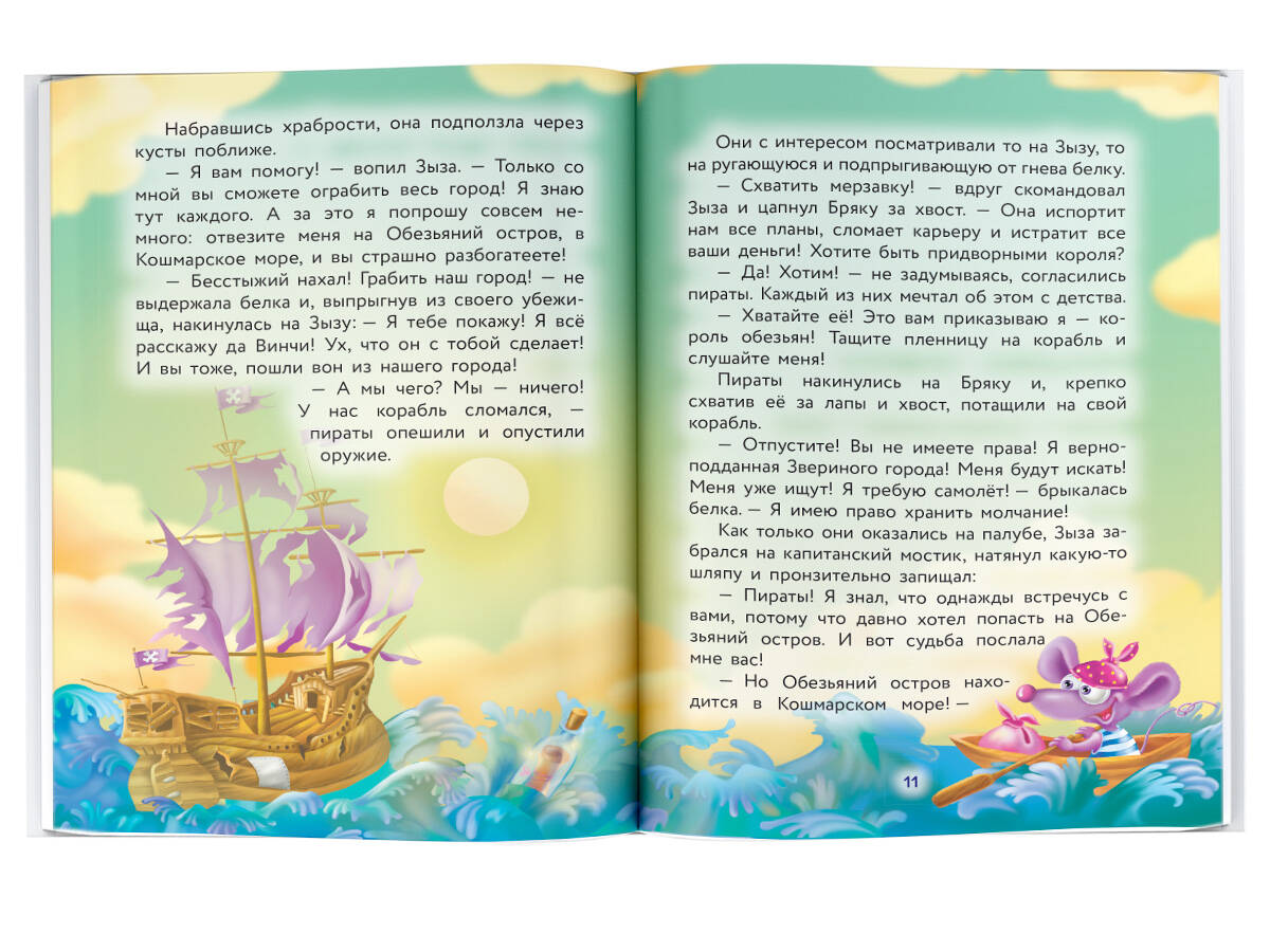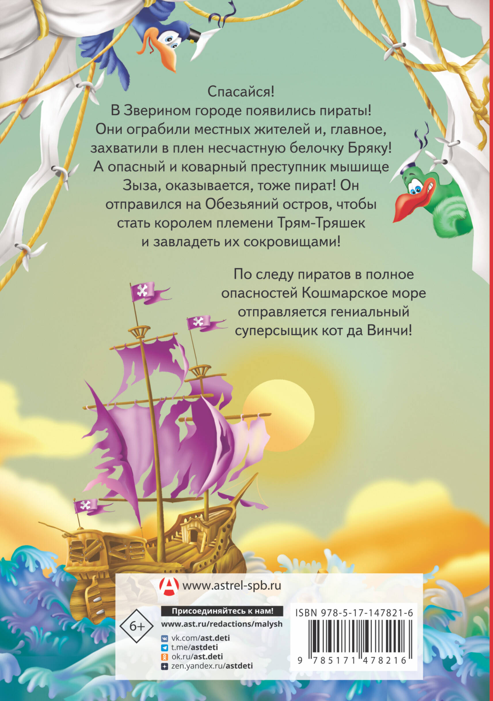 Спасайся! В Зверином городе появились пираты! Они ограбили местных жителей и, главное, захватили в плен несчастную белочку Бряку! А опасный и коварный преступник мышище Зыза, оказывается, тоже пират! Он отправился на Обезьяний остров, чтобы стать королём племени Трям-Тряшек и завладеть их сокровищами! По следу пиратов в полное опасностей Кошмарское море отправляется гениальный суперсыщик кот да Винчи!| Издательство | АСТ |