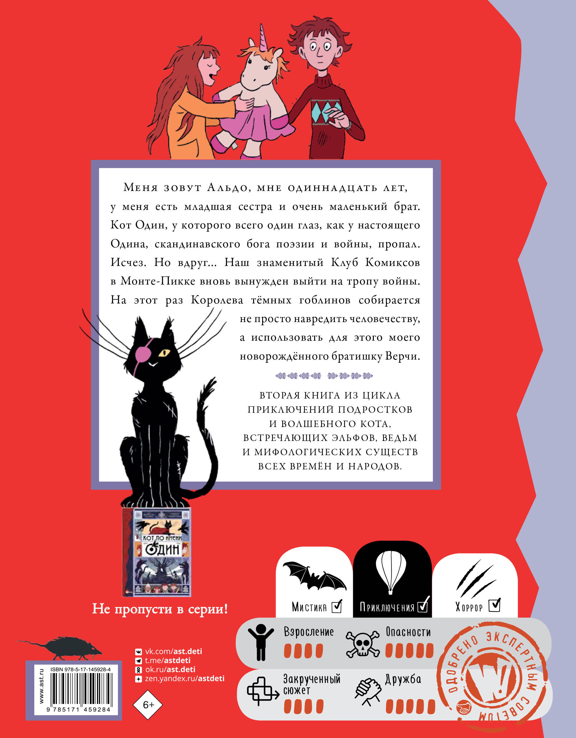 Меня зовут Альдо, мне одиннадцать лет, у меня есть младшая сестра и очень маленький брат. Кот Один, у которого всего один глаз, как у настоящего Одина, скандинавского бога поэзии и войны, пропал. Исчез. Но вдруг... Наш знаменитый Клуб Комиксов в Монте-Пикке вновь вынужден выйти на тропу войны. На этот раз Королева тёмных гоблинов собирается не просто навредить человечеству, а использовать для этого моего новорождённого братишку Верчи. Вторая книга из цикла приключений подростков и волшебного кота, встречающих эльфов, ведьм и мифологических существ всех времен и народов.| Издательство | АСТ |