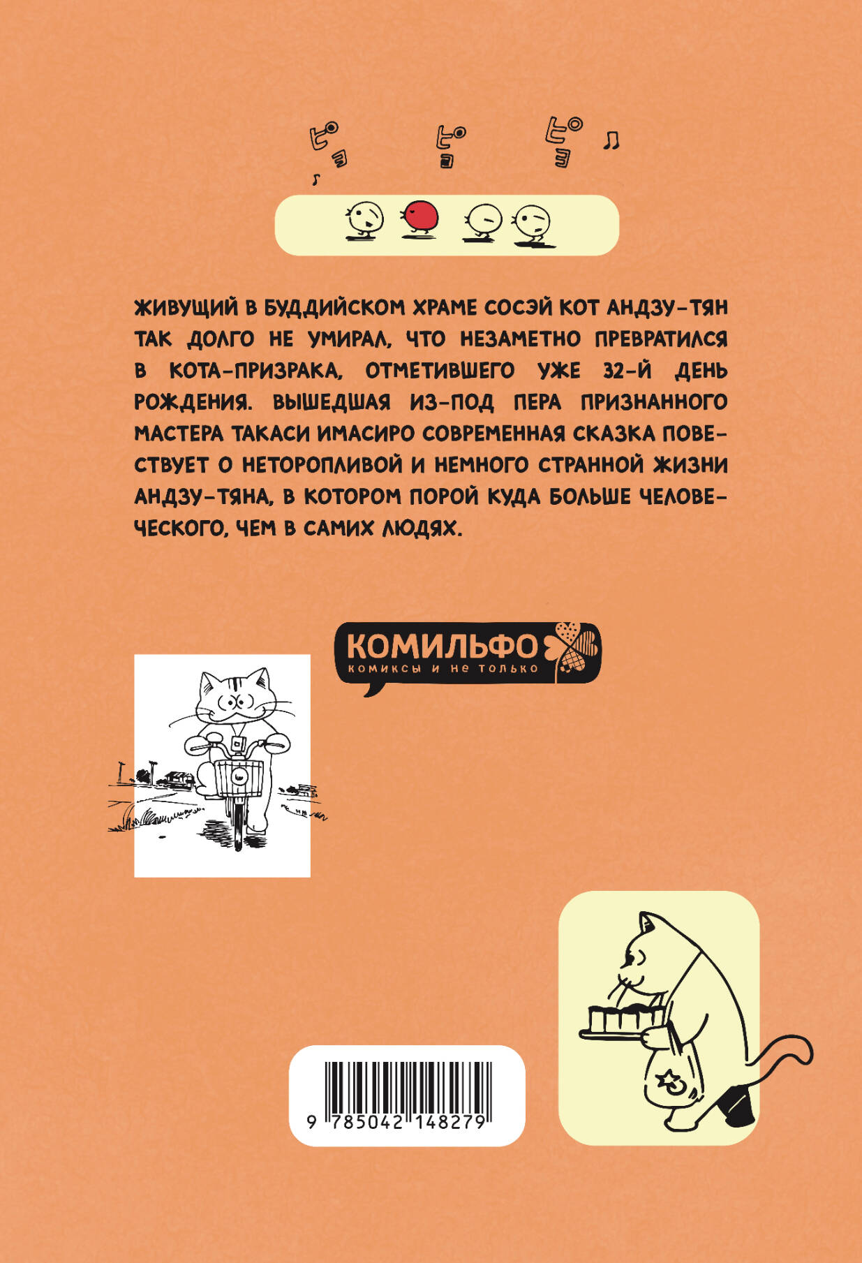 Живущий в буддийском храме Сосэй кот Андзу-тян так долго не умирал, что незаметно превратился в кота-призрака, отметившего уже 32-й день рождения. Вышедшая из-под пера признанного мастера Такаси Имасиро современная сказка повествует о неторопливой и немного странной жизни Андзу-тяна, в котором порой куда больше человеческого, чем в самих людях. В 2024-м году манга получила одноимённую экранизацию. «Кот-призрак Андзу - не совсем призрак в привычном нам понимании, ведь фактически он не вернулся из мира мёртвых, а просто не умер, даже когда достиг преклонного для кошек возраста. Вместо этого он стал бакэнэко, одним из ёкаев - так называют разнообразную японскую нежить, включающую в себя в том числе и привидения». Анастасия Дёмина, переводчица «Интересная задумка. Весёлая история про японского Гарфилда. Мне было интересно работать с этой картиной, где автор (режиссёр) смешал простое и житейское с миром духов и фантазии». Александр Скиданов, актёр, голос кота Андзу в аниме-адаптации| Издательство | ООО "Издательство "Эксмо" |