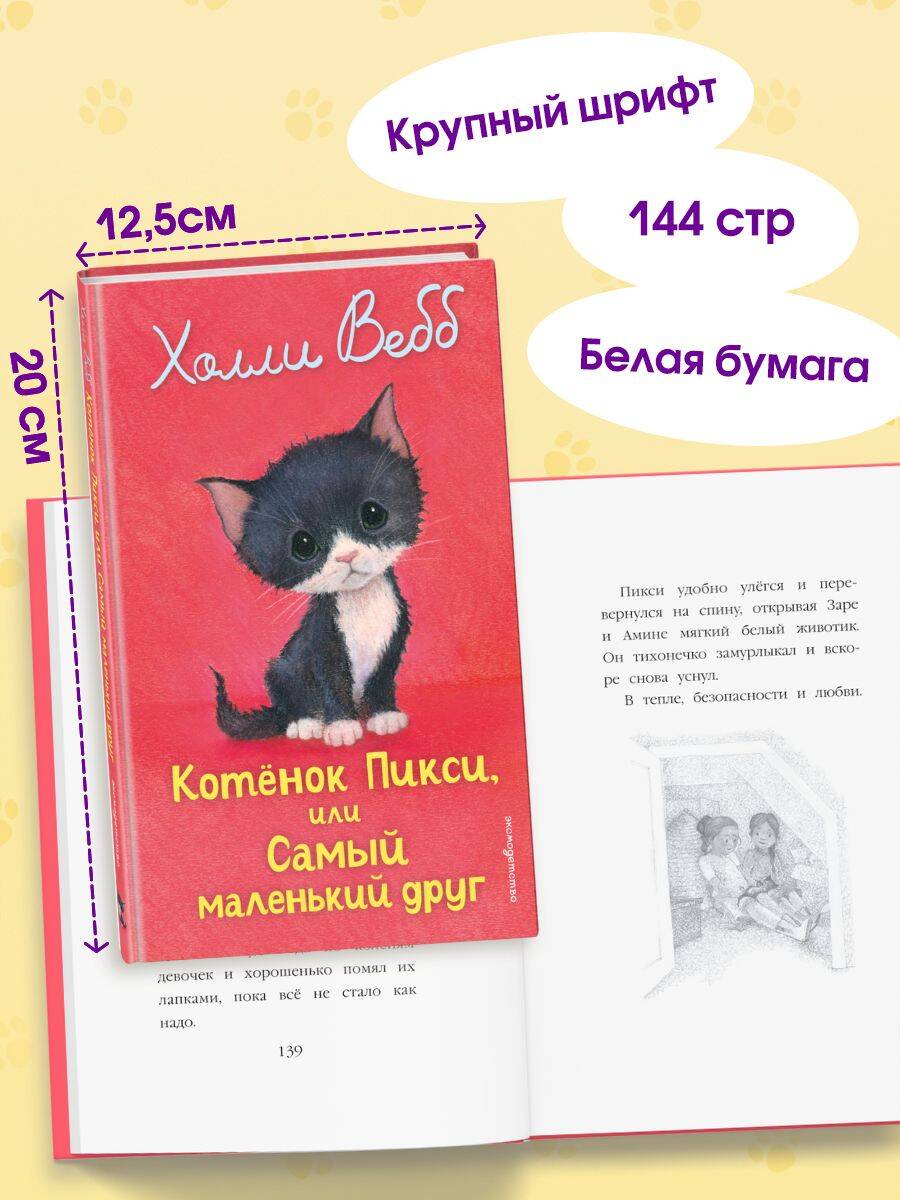 НОВИНКА ОТ ХОЛЛИ ВЕББ - АВТОРА СЕРИИ-БЕСТСЕЛЛЕРА «ДОБРЫЕ ИСТОРИИ О ЗВЕРЯТАХ»! Трогательная история о дружбе девочки и котёнка - для мальчиков и девочек 6-9 лет! Близняшки Зара и Амина переезжают в новый город и по-разному привыкают к переменам. Амина легко находит друзей, а Зара чувствует себя одинокой. Всё меняется, когда в семье появляется крошечный чёрно-белый котёнок Пикси, взятый из приюта. Именно он помогает робкой Заре стать увереннее и завести новых друзей. Но однажды во время ссоры девочек Пикси пропадает… Сумеют ли сёстры объединиться, чтобы вернуть своего маленького друга? Увлекательный рассказ о животных поможет ребёнку полюбить книги, научиться читать с удовольствием и навсегда запомнить первую любимую книжку про котёнка! Во всех книгах серии законченный сюжет, поэтому их можно читать в любом порядке. Книга с крупными буквами, на белой бумаге, внутри красивые чёрно-белые иллюстрации художницы Софи Вильямс, которые позволят детям переключать внимание, не нагружая глаза. Подходит для первого самостоятельного чтения. Холли Вебб - писательница, популярная во всём мире, но особенно её полюбили в России, что подтверждают многомиллионные тиражи. Читайте другие книги в серии «Добрые истории о зверятах. Мировой бестселлер», а также серии «Котята в музее» и «Мейзи Хитчинс. Приключения девочки-детектива»!| Издательство | ООО "Издательство "Эксмо" |