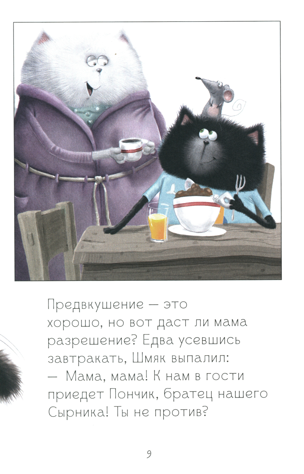 К мышонку Сырнику приезжает его братец Пончик. Шмяк очень рад, но волнуется - вдруг он не сумеет принять дорогого гостя как следует? Однако мышкибратишки остались очень довольны, хотя кое-что и пошло не по плану.Шмяк теперь точно знает: один мышонок - это компания, а два мышонка - праздник!| Издательство | Клевер-Медиа-Групп |
