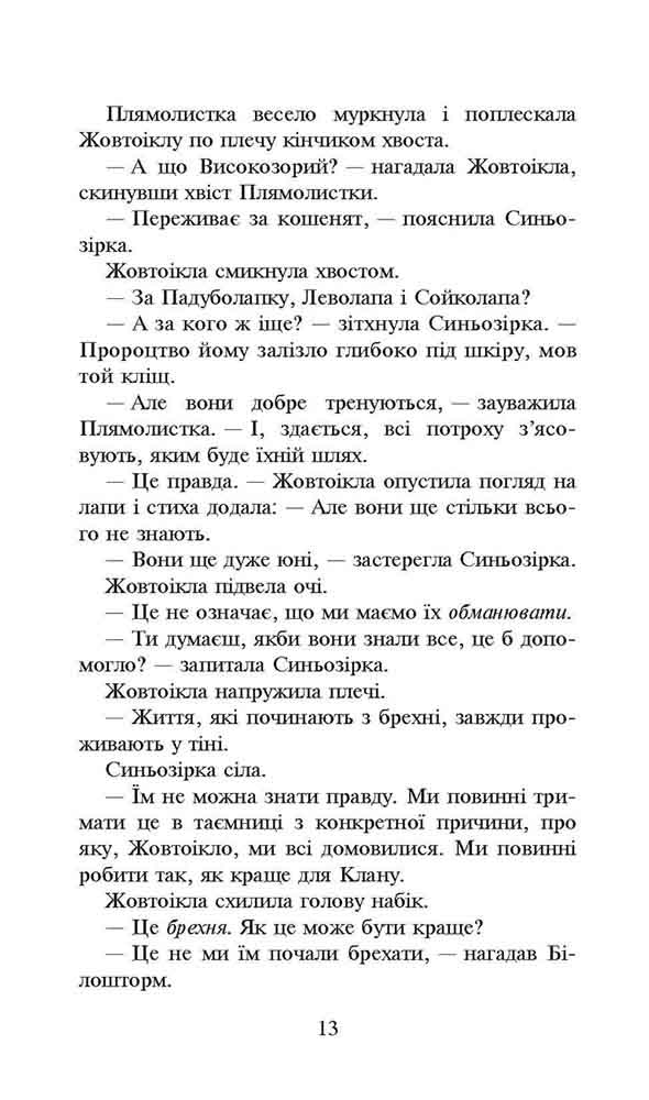 СВІТОВИЙ БЕСТСЕЛЕР Четверта книга третього циклу «Сила трьох» серії світового бестселера «Коти-вояки». Усі троє обраних дізналися про пророцтво. Однак це знання стає для них тягарем. Сила, яку вони отримали, настільки потужна, що її складно контролювати. До того ж між Кланами зростає напруга. Вітряні вояки все частіше полюють на Громовій території, нехтуючи вояцьким правильником. Це вже не просто порушення кордонів, це виклик. Темрява загрожує поглинути чотири Клани, зруйнувавши все, у що вони вірили. Чому їм не допоміг Зореклан? Невже відтепер світ лісових котів зміниться назавжди? Переклад з англійської - Катерина Дудка, Остап Українець. Оформлення - Олег Панченко. При перекладі тексту українською для опису загального устрою котячих кланів та громадянства їхніх членів була використана термінологія Національної скаутської організації України «Пласт». Подарунок - фірмовий колекційний котомагніт. Чому варто читати: Продовження пригодницької серії про вже знайомих читачам котів-вояків. Книги серії мають поціновувачів в Англії, США, Німеччині, Франції, Іспанії, Італії, Польщі, Чехії, Японії, Китаї… - понад 30 000 000 читачів й фанів у всьому світі! Автор: Серія «Коти-вояки» створена британськими письменницями Кейт Кері, Черіт Болдрі, Тай Сазерленд у співавторстві з редактором Вікторією Голмс під загальним псевдонімом Ерін Гантер. Серія видається у Великій Британії з 2003 року і дотепер. Вона потрапила до списку світових бестселерів за версією «Нью-Йорк Таймс» і стала популярною у багатьох країнах світу. Офіційний сайт «Котів-вояків»: www.warriors.com.ua| Дата выпуска | 0000-00-00 |