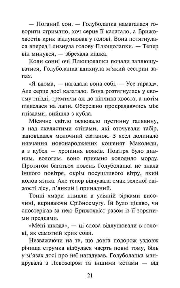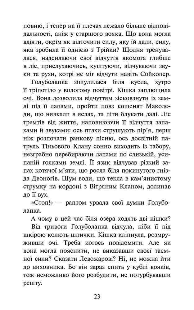 СВІТОВИЙ БЕСТСЕЛЕР Друга книга четвертого циклу «Знамення Зореклану» серії світового бестселера «Коти-вояки». Трійка обраних нарешті зібралася. Але призначення кожного ще невідоме. Після того, як спільному вояцькому патрулю вдалося повернути воду, що зникла через збудовану бобрами плотину, й подолати посуху, життя Громового Клану, здавалося б, теж увійшло у свої береги. Але природа знову випробовує мешканців Громового табору на міцність. До того ж одного з новаків уві сні починає навідувати таємничий гість. Що саме він обіцяє та чи дійсно все так, як каже? І хто він, друг чи ворог? Оформлення - Олег Панченко. При перекладі тексту українською для опису загального устрою котячих кланів та громадянства їхніх членів була використана термінологія Національної скаутської організації України «Пласт». Подарунок - фірмовий колекційний котомагніт. Чому варто прочитати: Серія пригодницьких романів-фентезі, які читають підлітки та їх батьки. Книги серії мають поціновувачів в Англії, США, Німеччині, Франції, Іспанії, Італії, Польщі, Чехії, Японії, Китаї… - понад 30 000 000 читачів й фанів у всьому світі! Автор: Серія «Коти-вояки» створена британськими письменницями Кейт Кері, Черіт Болдрі, Тай Сазерленд у співавторстві з редактором Вікторією Голмс під загальним псевдонімом Ерін Гантер. Серія видається у Великій Британії з 2003 року і дотепер. Вона потрапила до списку світових бестселерів за версією «Нью-Йорк Таймс» і стала популярною у багатьох країнах світу. Офіційний сайт «Котів-вояків»: www.warriors.com.ua| ISBN | 978-617-8229-93-1 |