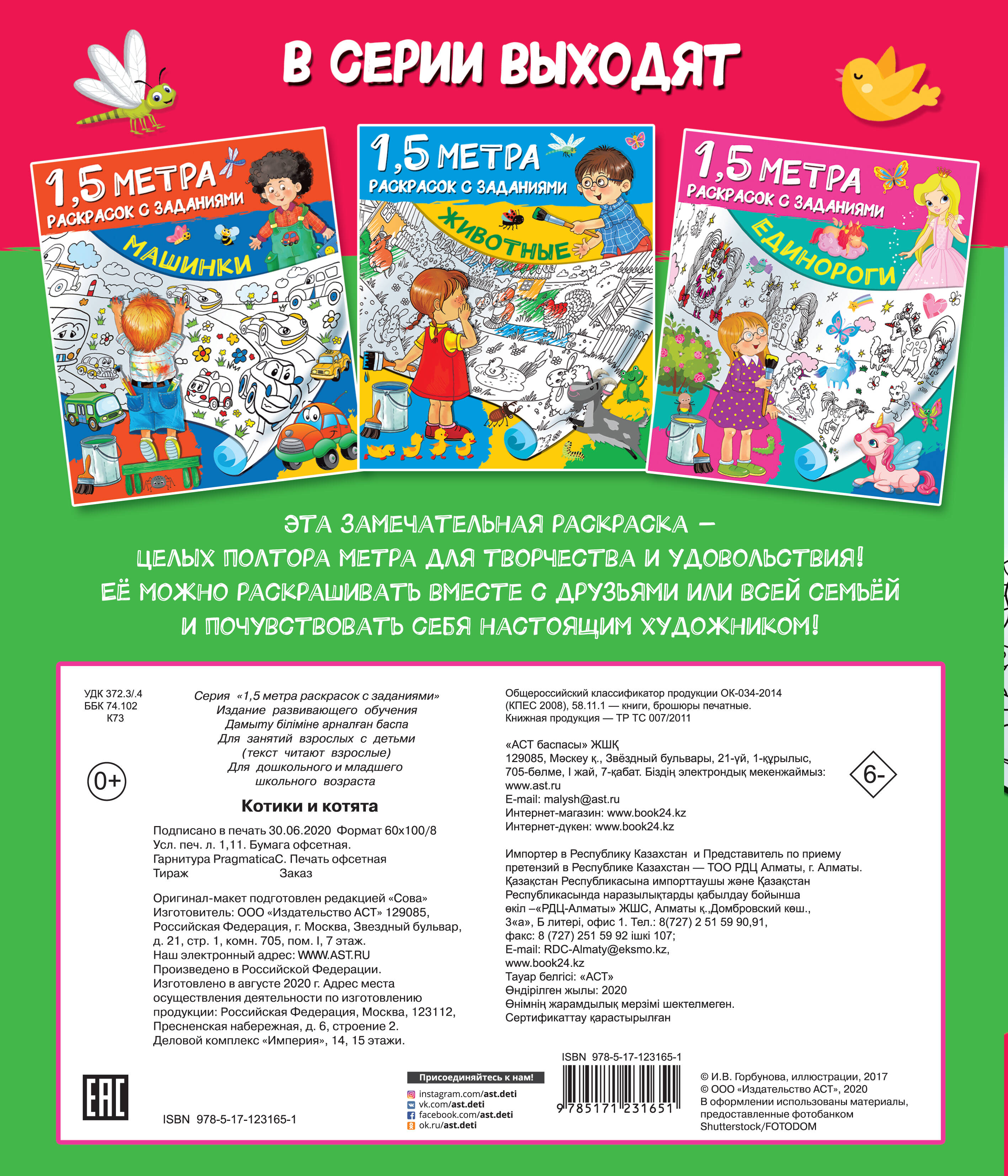 О чем эта книга Все дети любят рисовать и раскрашивать котиков - малышам обязательно понравится новая серия книг «Полтора метра раскрасок с заданиями». Эту красочную полутораметровую активити-раскраску с игровыми заданиями можно разложить на полу или повесить на стену, можно раскрашивать карандашами или фломастерами, можно одному или компанией. В любом случае получится неповторимый шедевр! Кому эта книга будет интересна Уникальная активити-раскраска большого формата придумана специально для настоящих фантазеров и будущих художников. Каковы особенности этой книги Эта активити-раскраска - целых полтора метра для творчества и удовольствия, ее можно раскрашивать всей семьей. Увлекательная и полезная книжка с цветными картинками и игровыми заданиями отлично развивает пространственное мышление и воображение, наблюдательность, координацию и мелкую моторику. Множество деталей и милых кошачьих мордашек понравятся каждому маленькому фантазеру и художнику. Полтора метра раскрасок с заданиями - играем, раскрашиваем и творим в свое удовольствие!| Издательство | Издательство "АСТ" |