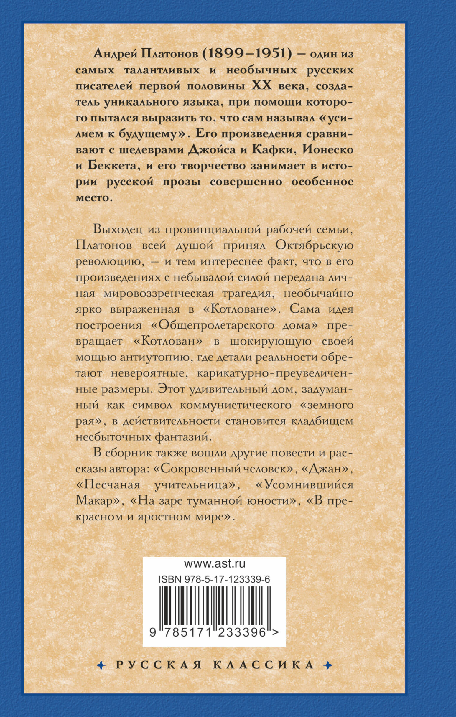 Выходец из провинциальной рабочей семьи, Платонов всей душой принял Октябрьскую революцию, - и тем интереснее факт, что в его произведениях с небывалой силой передана личная мировоззренческая трагедия, необычайно ярко выраженная в "Котловане". Сама идея построения "Общепролетарского дома" превращает "Котлован" в шокирующую своей мощью антиутопию, где детали реальности обретают невероятные, карикатурно-преувеличенные размеры. Этот удивительный дом, задуманный как символ коммунистического "земного рая", в действительности становится кладбищем несбыточных фантазий. В сборник также вошли другие повести и рассказы автора: "Сокровенный человек", "Джан", "Песчаная учительница", "Усомнившийся Макар", "На заре туманной юности", "В прекрасном и яростном мире".| Издательство | Издательство "АСТ" |