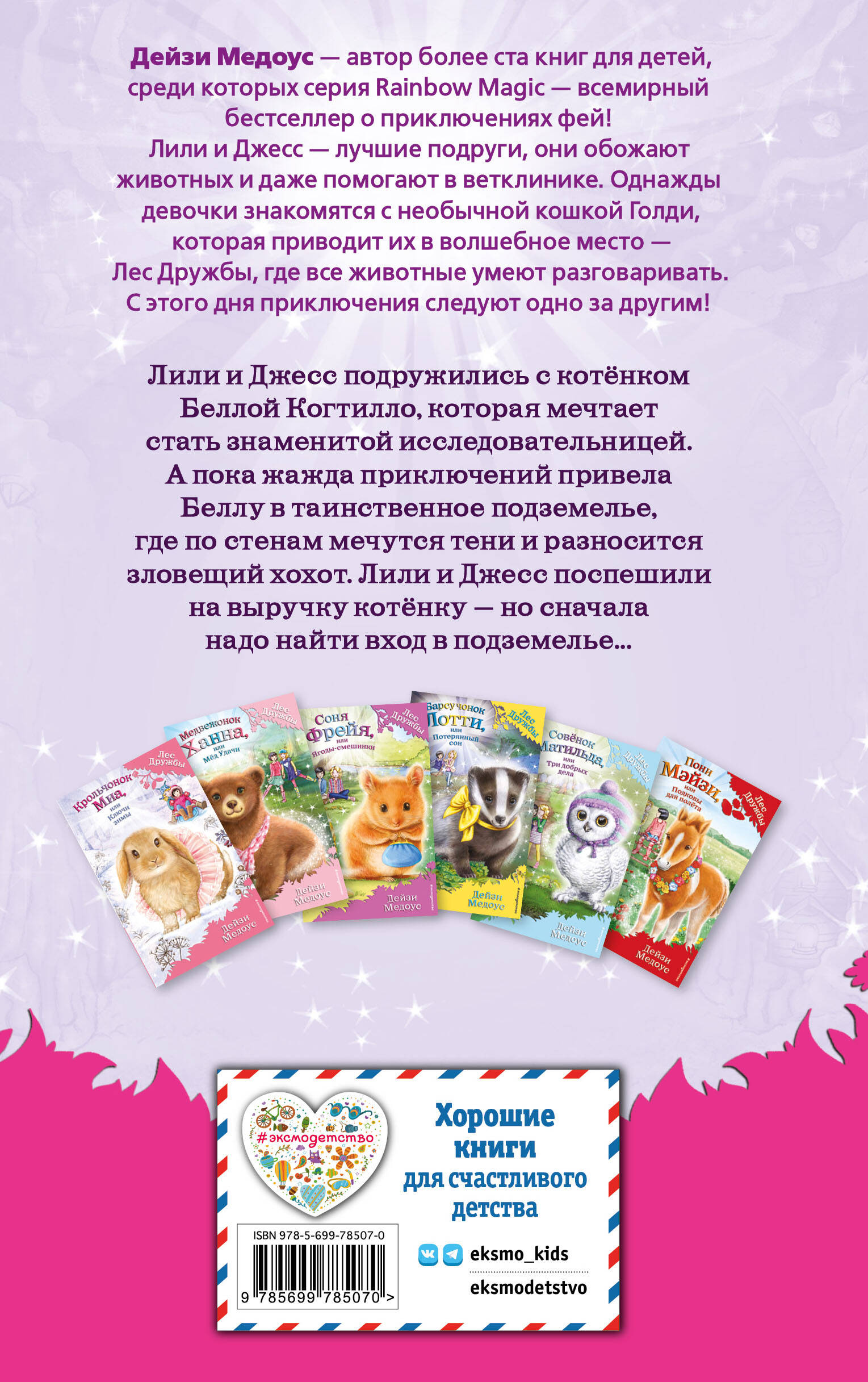 Куда может завести любопытство? Котёнка Беллу оно завело в таинственное подземелье, где по стенам мечутся тени и разносится зловещий хохот. Хорошо, что Белла всегда мечтала стать знаменитой исследовательницей, и её ничто не пугает. Но выбраться из подземелья всё равно будет непросто… Книга для тех, кто мечтает оказаться в волшебной стране, где живут говорящие животные, с которыми можно дружить и пускаться в приключения! Дейзи Медоус - автор более ста книг для детей, среди которых серия Rainbow Magic - всемирный бестселлер о приключениях фей! Крупный шрифт, красивые чёрно-белые иллюстрации, увлекательная история понравятся тем детям, которые уже любят читать, и тем, у которых навыки чтения ещё не закрепились.| Издательство | ООО "Издательство "Эксмо" |