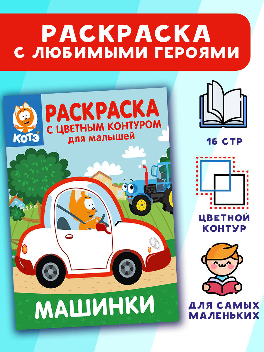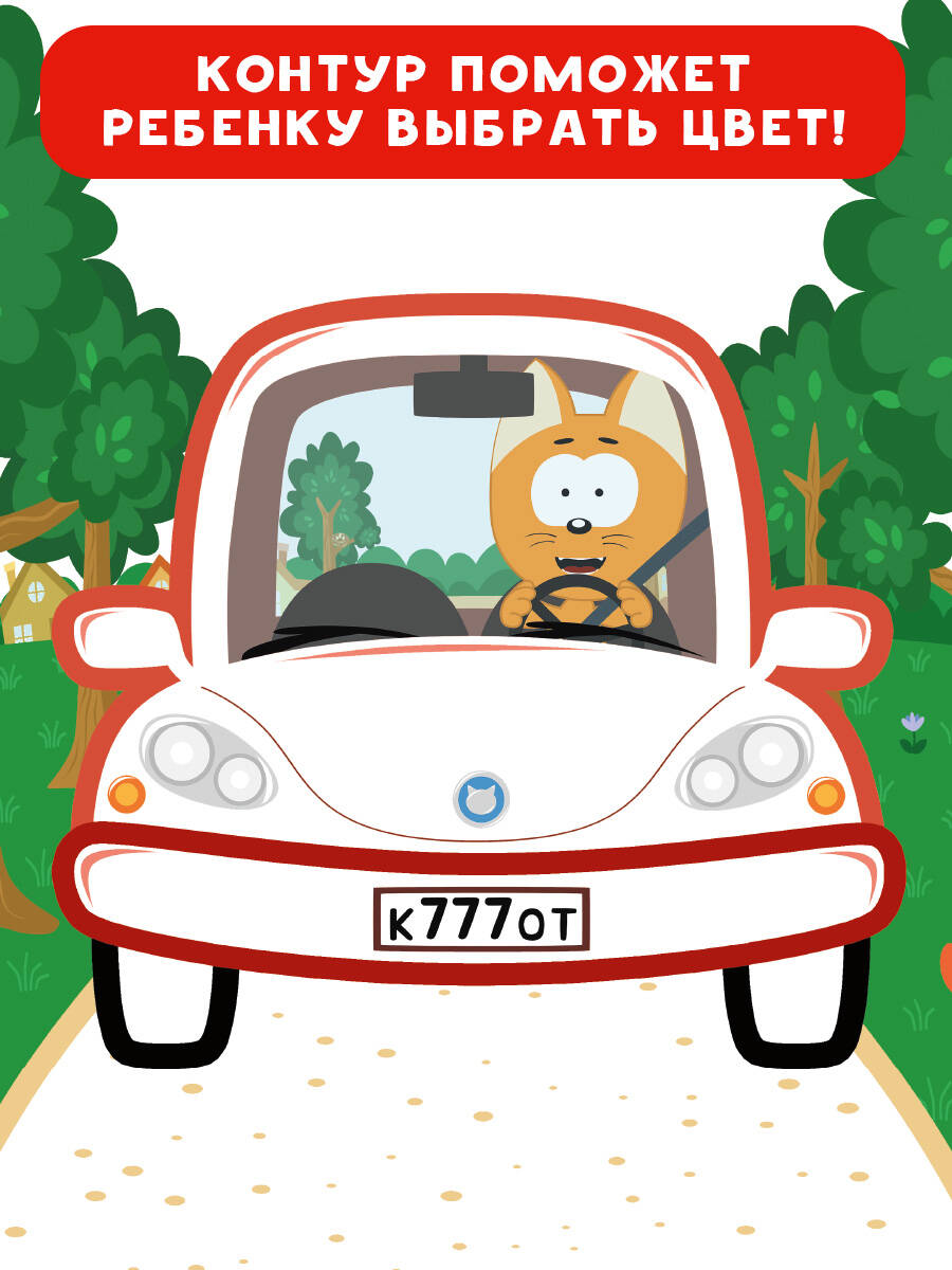 Котёнок Котэ. Раскраска с цветным контуром для малышей. Машинки