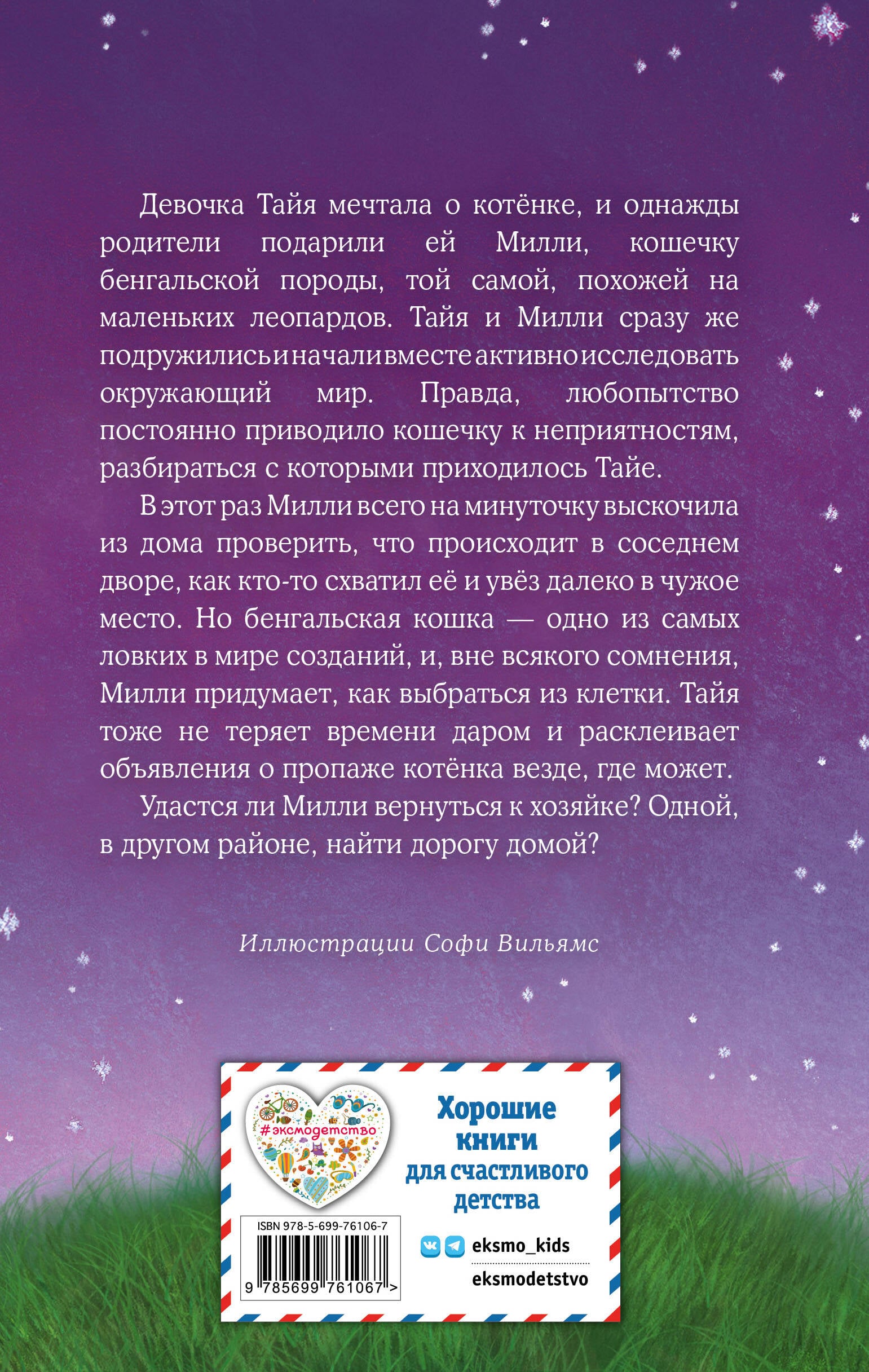 Девочка Тайя мечтала о котёнке, и однажды родители подарили ей Милли, кошечку бенгальской породы, той самой, похожей на маленьких леопардов. Тайя и Милли сразу же подружились и начали вместе активно исследовать окружающий мир. Правда, любопытство постоянно приводило кошечку к неприятностям, разбираться с которыми приходилось Тайе. В этот раз Милли всего на минуточку выскочила из дома проверить, что происходит в соседнем дворе, как кто-то схватил её и увёз далеко в чужое место. Но бенгальская кошка - одно из самых ловких в мире созданий, и вне всякого сомнения Милли придумает, как выбраться из клетки. Тайя тоже не теряет времени даром и расклеивает объявления о пропаже котёнка везде, где может. Удастся ли Милли вернуться к хозяйке? Издание на белой бумаге, внутри достаточно крупный шрифт и красивые чёрно-белые иллюстрации, которые позволят детям переключать внимание, не перенагружая глаза. Идеально для родителей, которые хотят, чтобы дети втянулись в чтение.| Издательство | ООО "Издательство "Эксмо" |