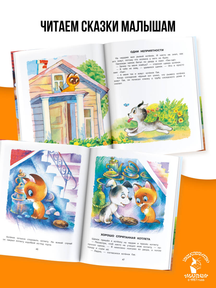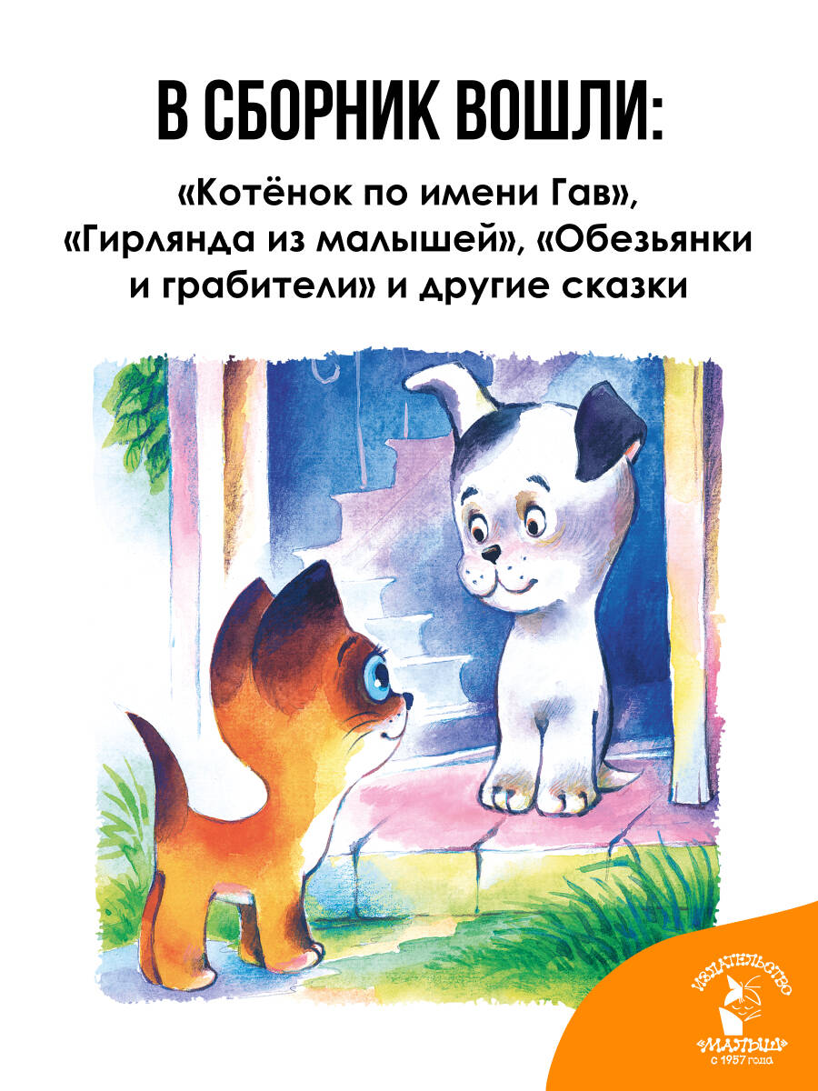 В книгу писателя Григория Остера вошли его знаменитые сказки: "Котёнок по имени Гав", "Как гусёнок потерялся", "Гирлянда из малышей", "Обезьянки и грабители" и другие. Добрые и смешные персонажи этих сказок очень отзывчивые и неравнодушные, а ситуации, в которые они попадают, вызывают улыбку и смех даже у самого строгого и требовательного читателя. Рисунки к сказкам нарисовали Л. Шварцман, Б. Акулиничев, Т. Черкасова, О. Боголюбова и Е. Ельская. Для дошкольного возраста.